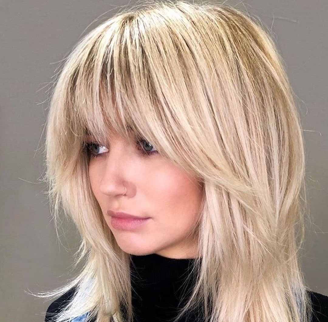 Стрижка Каскад на средние волосы с негустой челкой