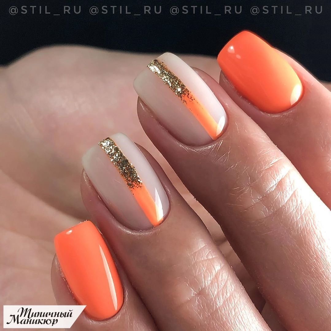 Маникюр оранжевый с золотом