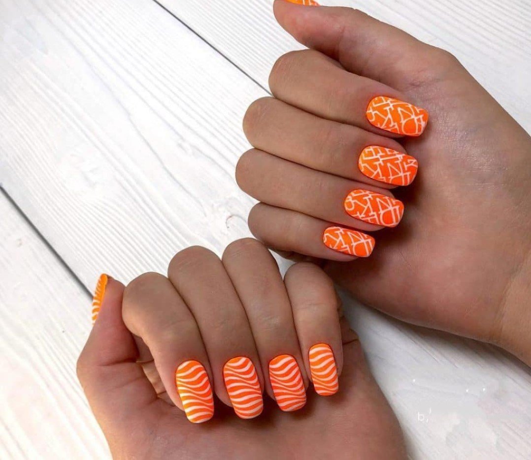 Дизайн ногтей оранжевый с белым