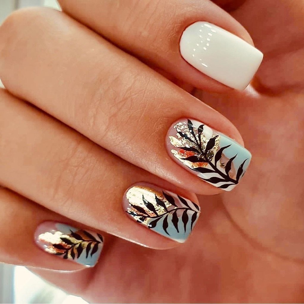 Маникюр с веточкой листьев