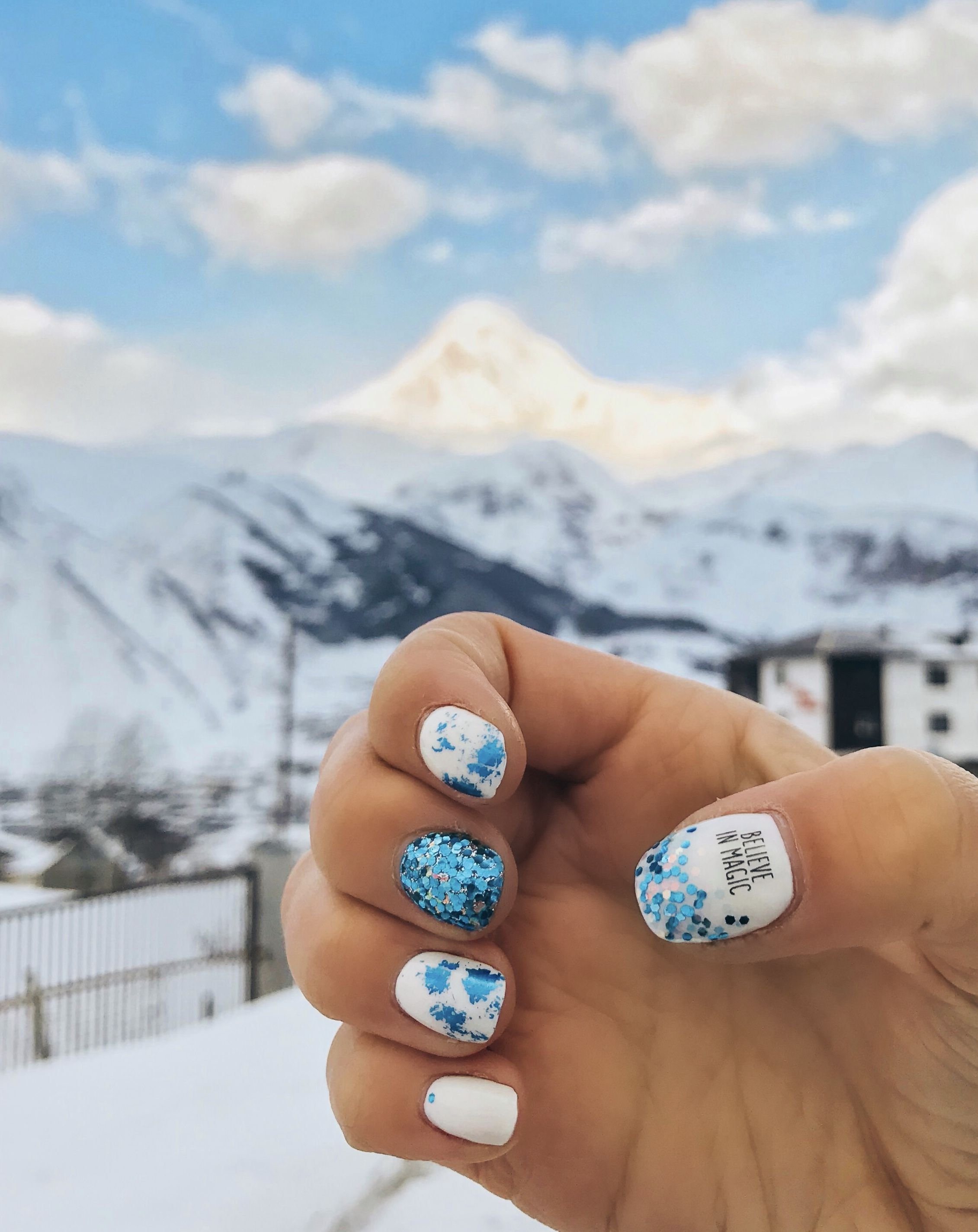 Маникюр белый с голубым с блестками