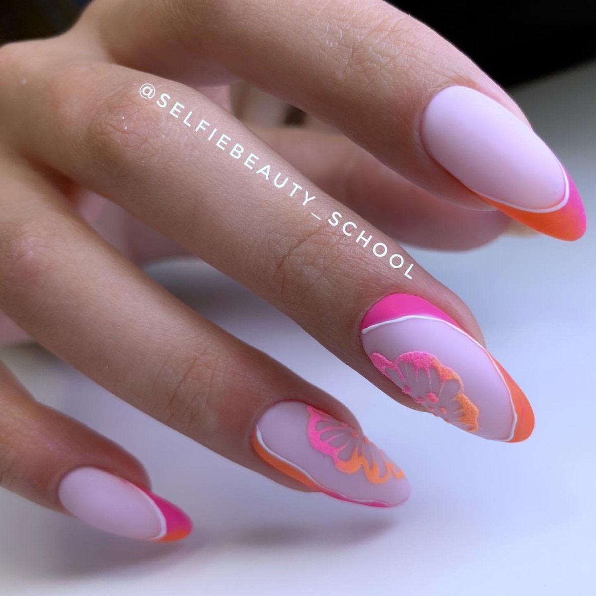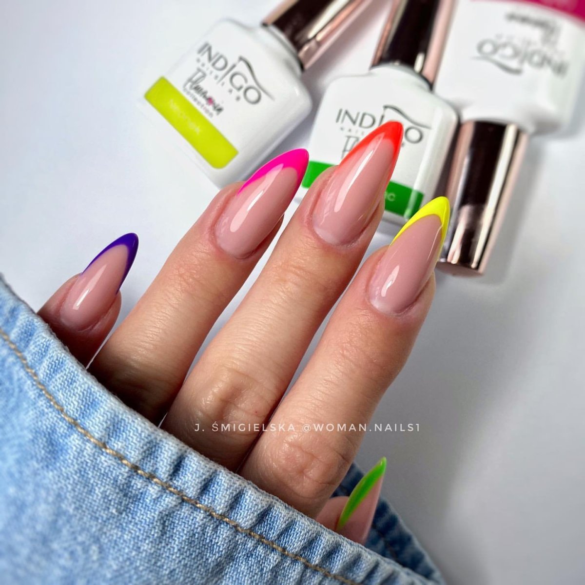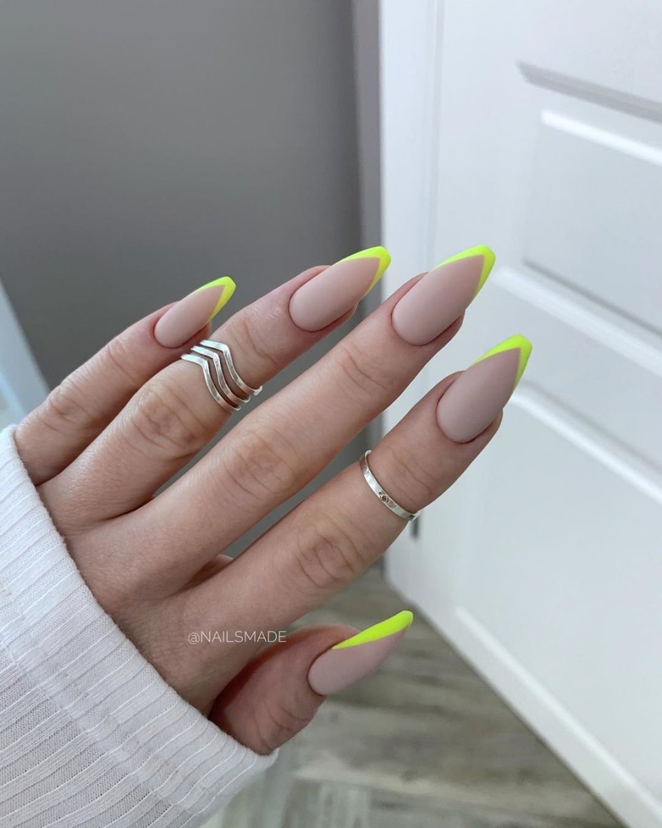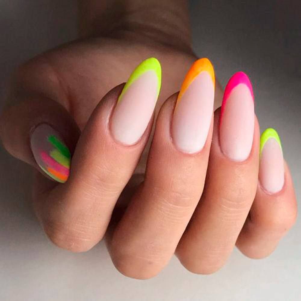 Неоновый френч на миндалевидных ногтях