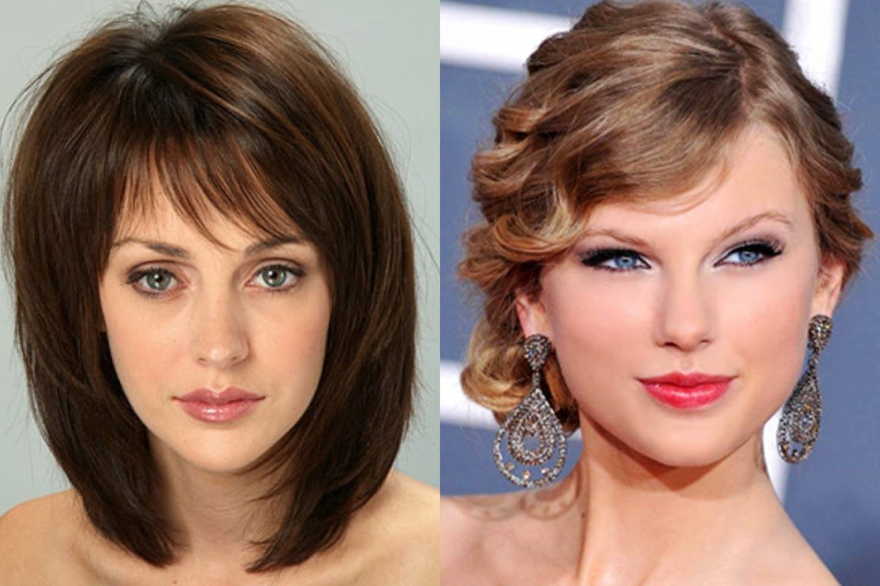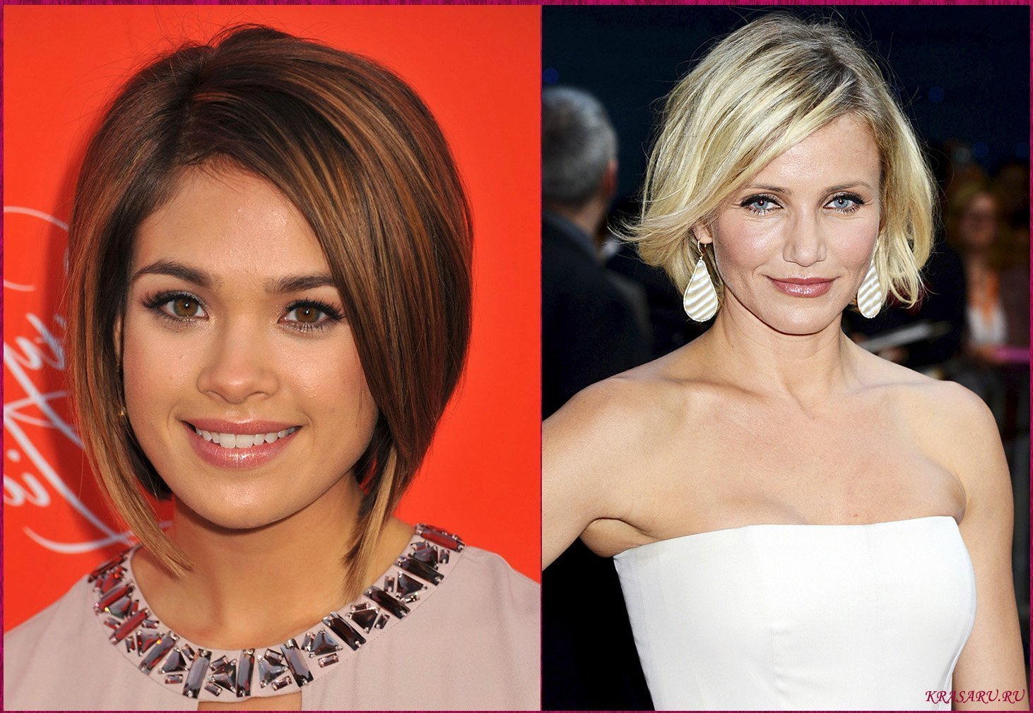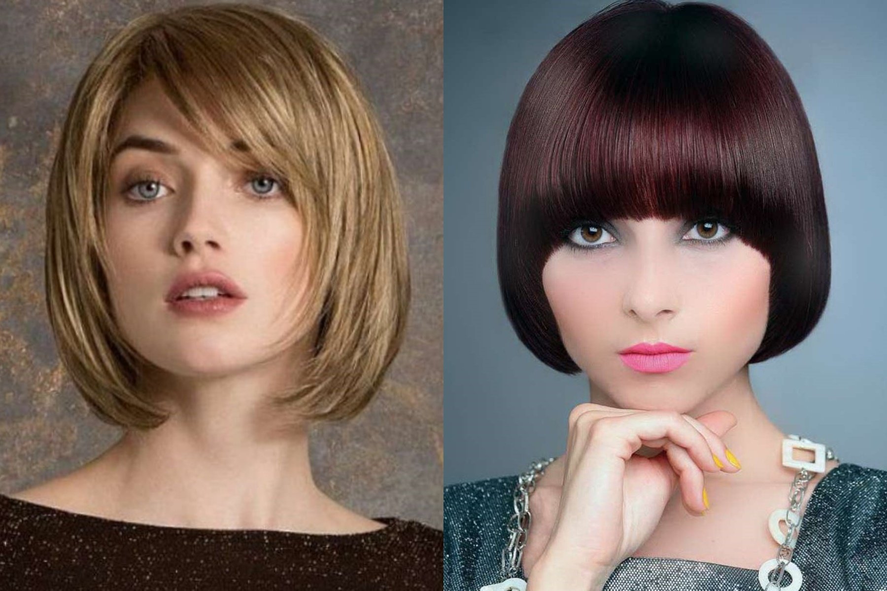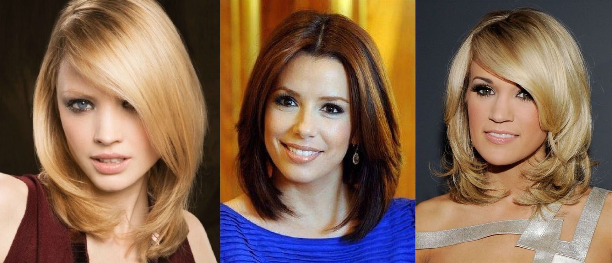 Стрижка типа каре на средние волосы с челкой для круглого лица