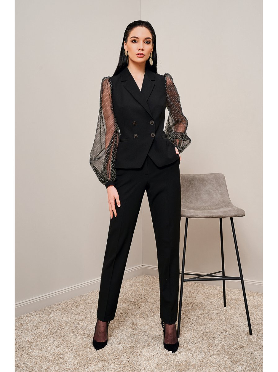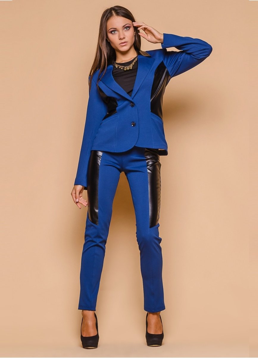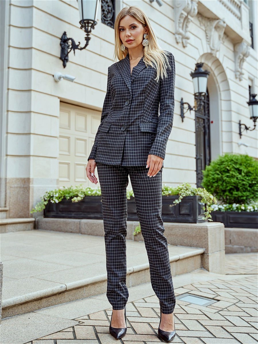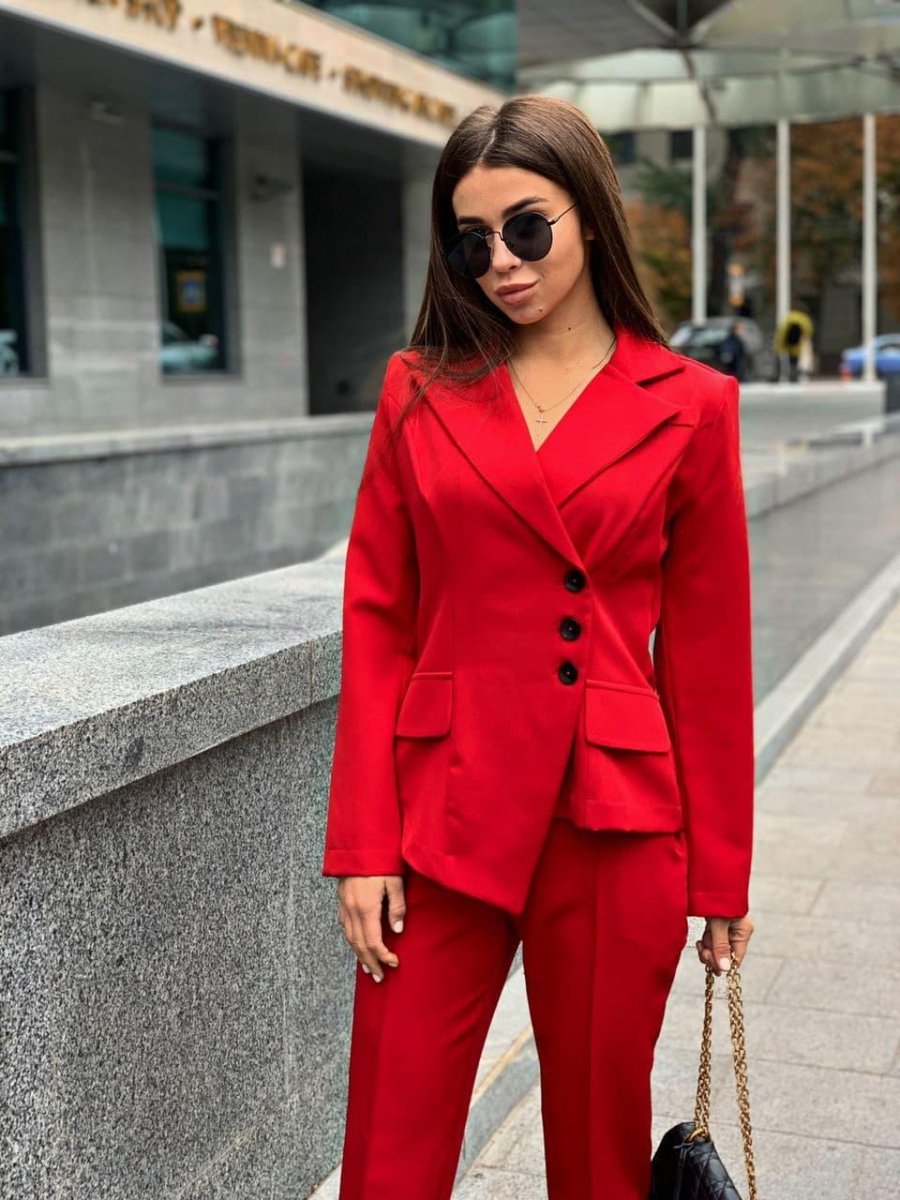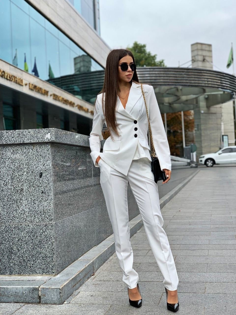 Показ мод женский брючный костюм с ассиметричным пиджаком