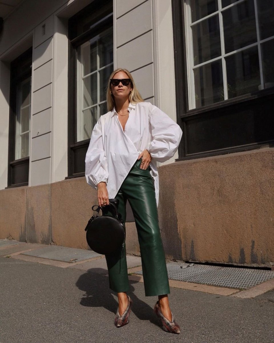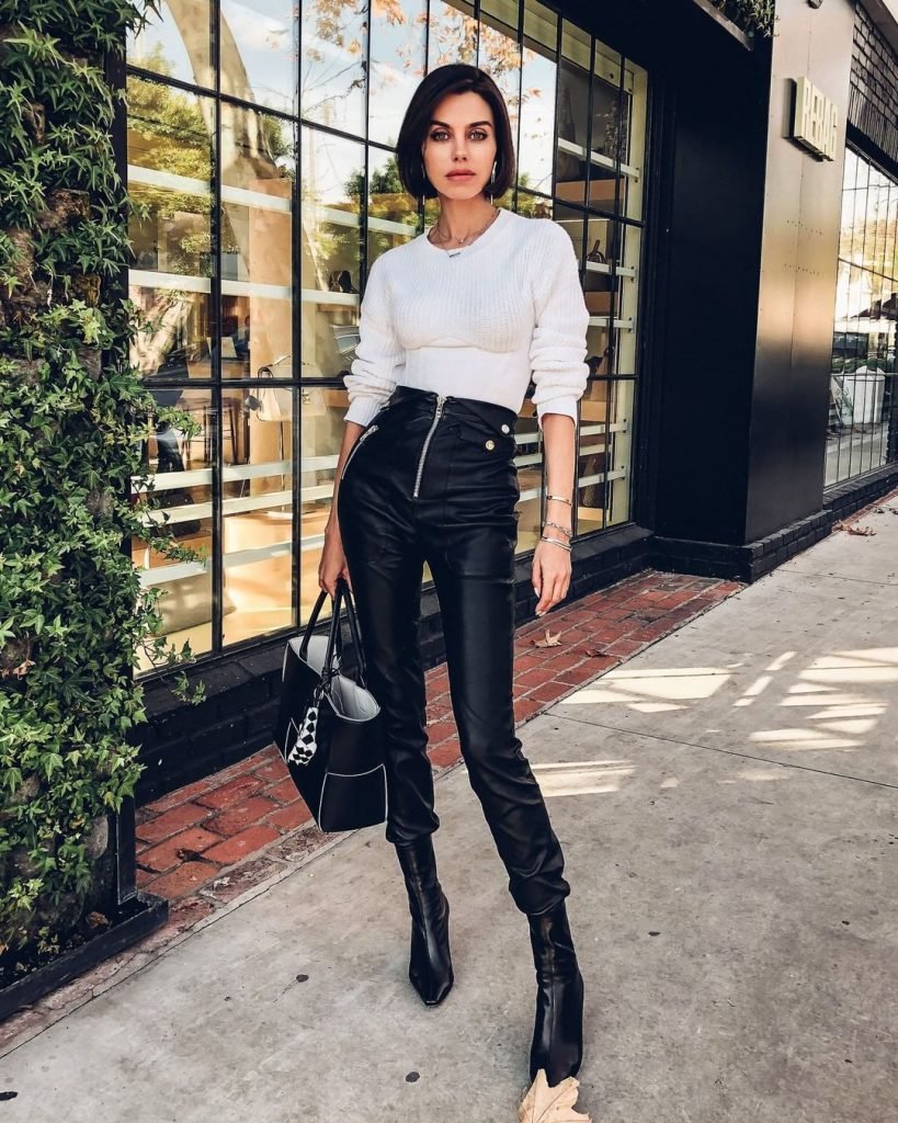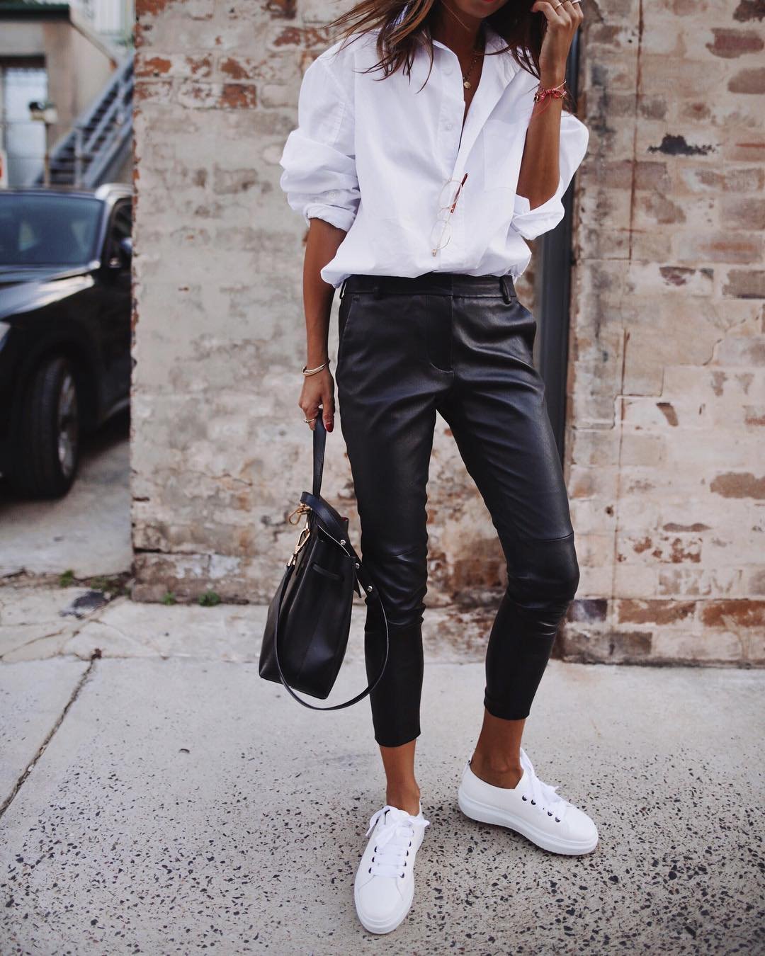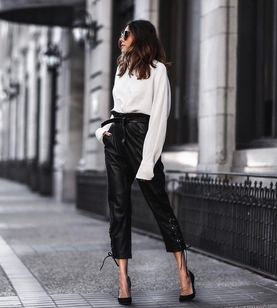 Кожаные брюки с белой рубашкой