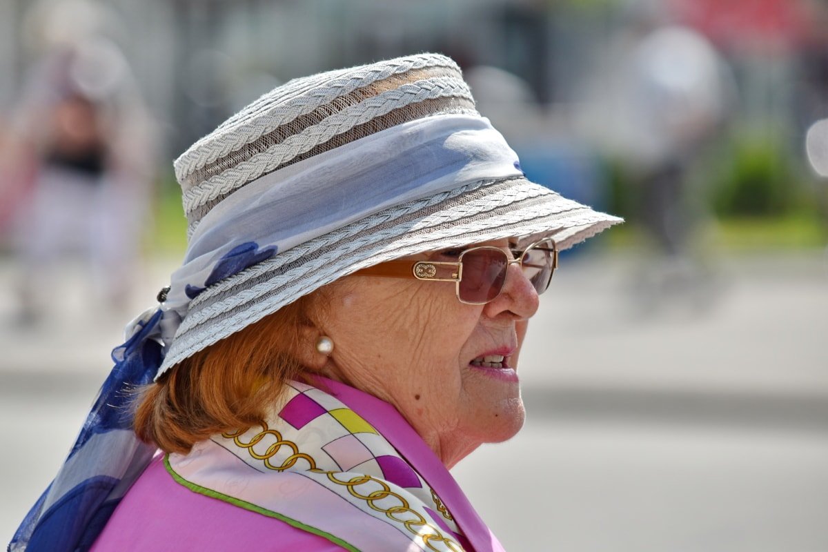 Пожилая женщина в очках и шляпе
