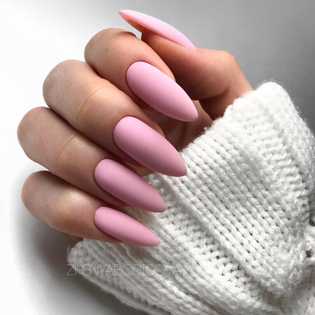 Розовый маникюр на миндалевидных ногтях