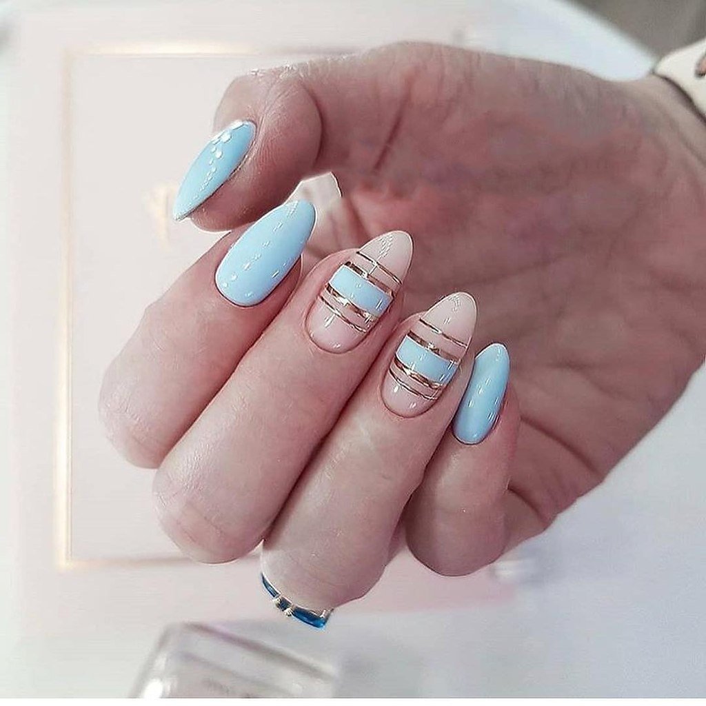 Маникюр светло голубой с полосками