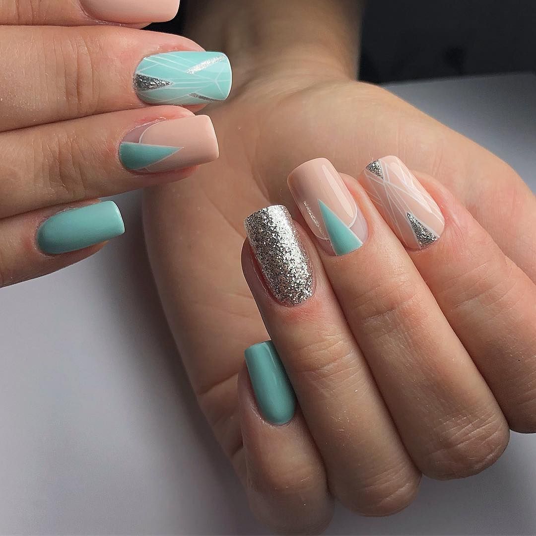 Маникюр бежевый с бирюзовым
