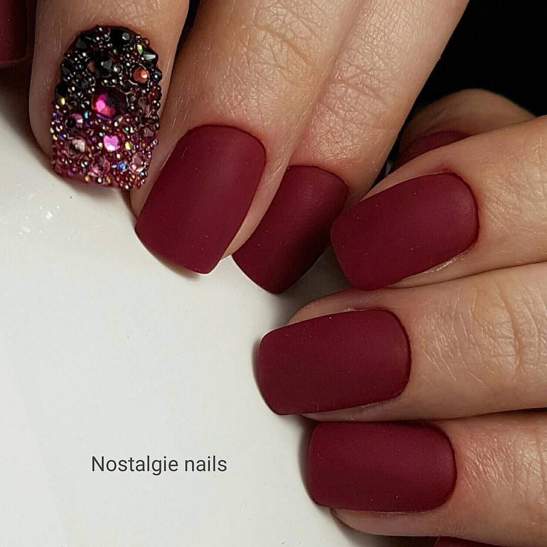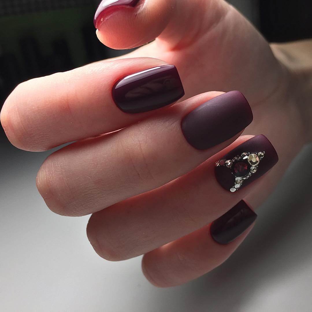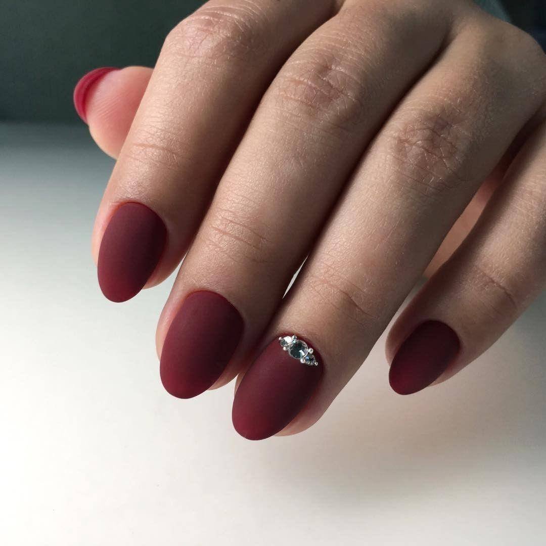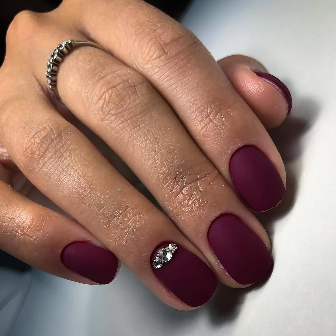 Матовый бордовый маникюр со стразами