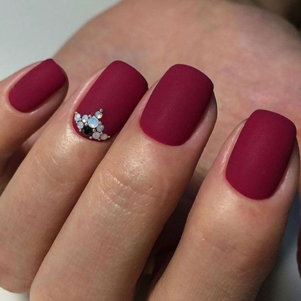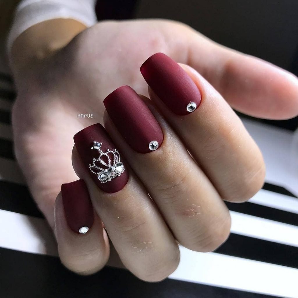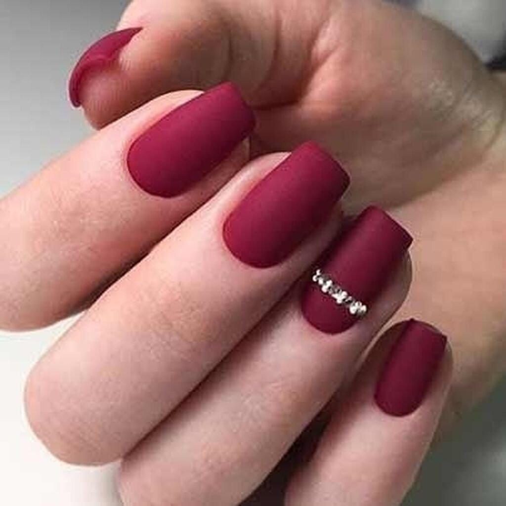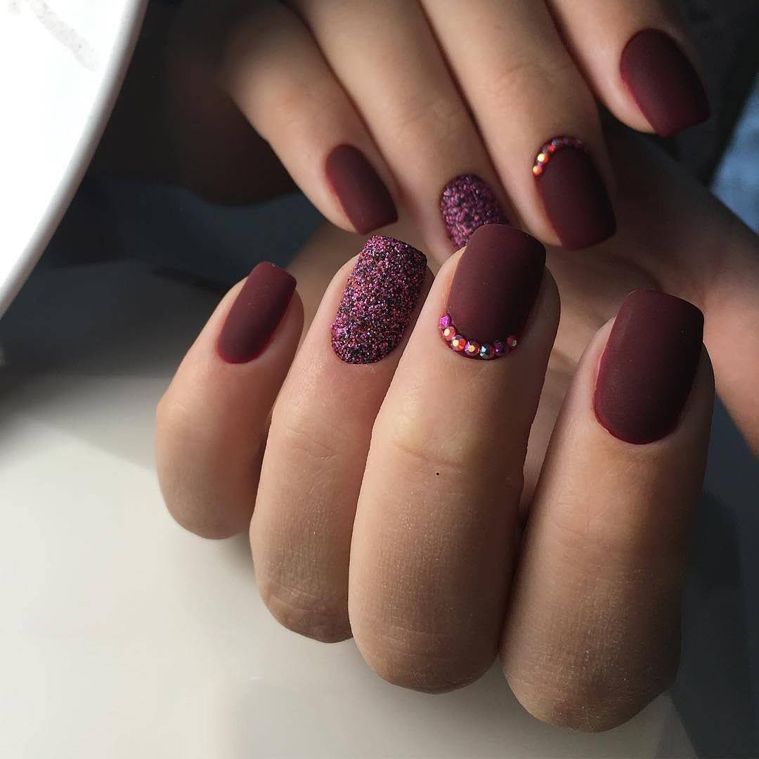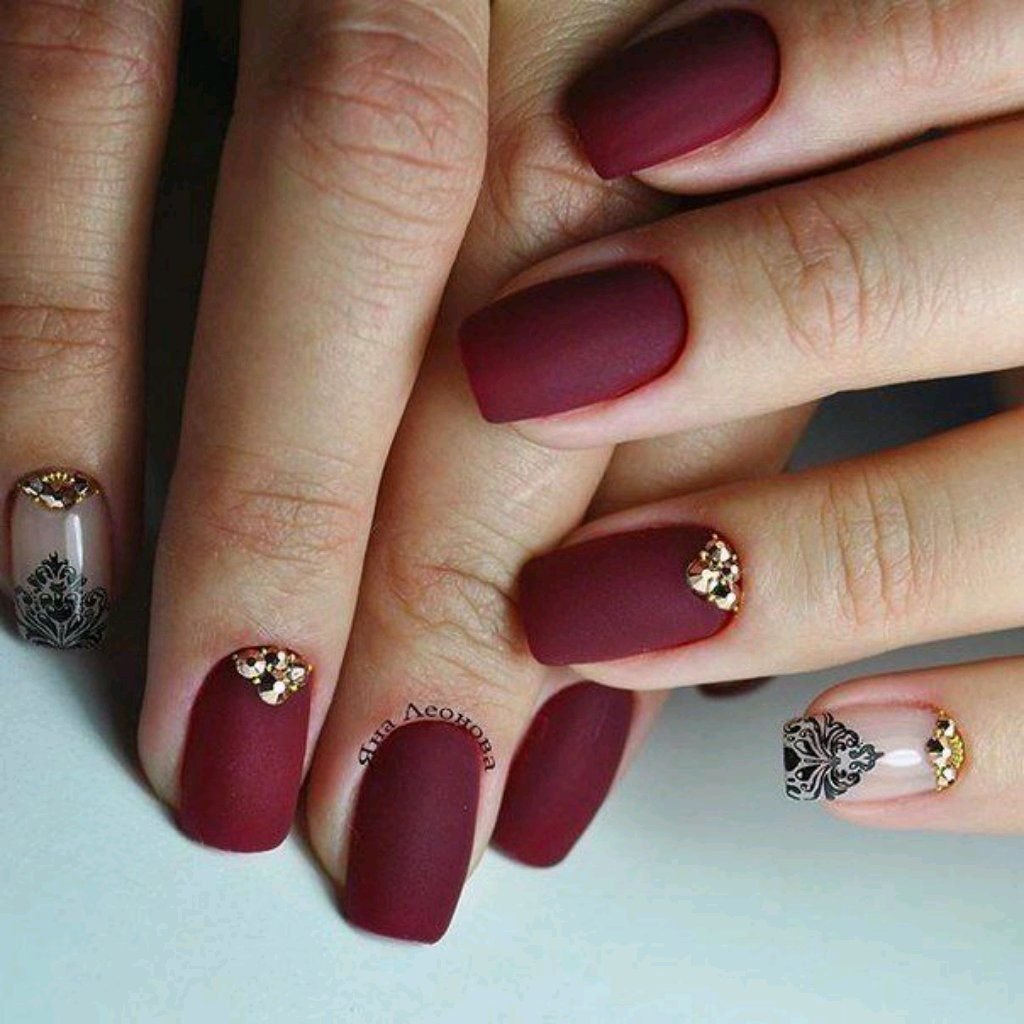 Матовый бордовый маникюр со стразами