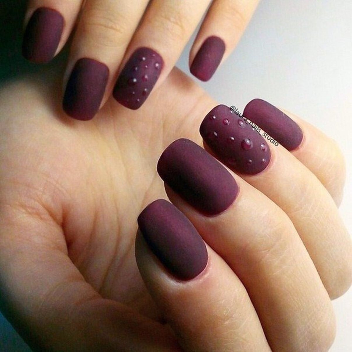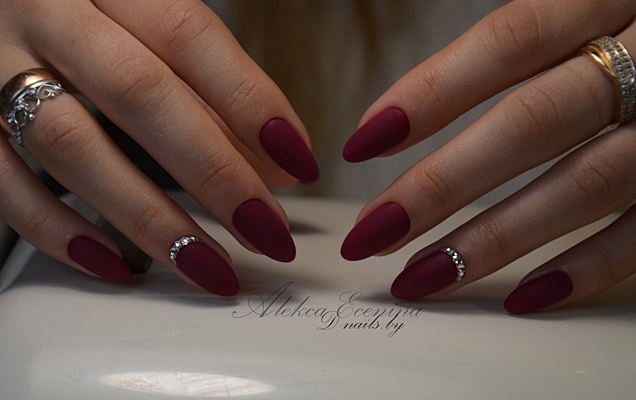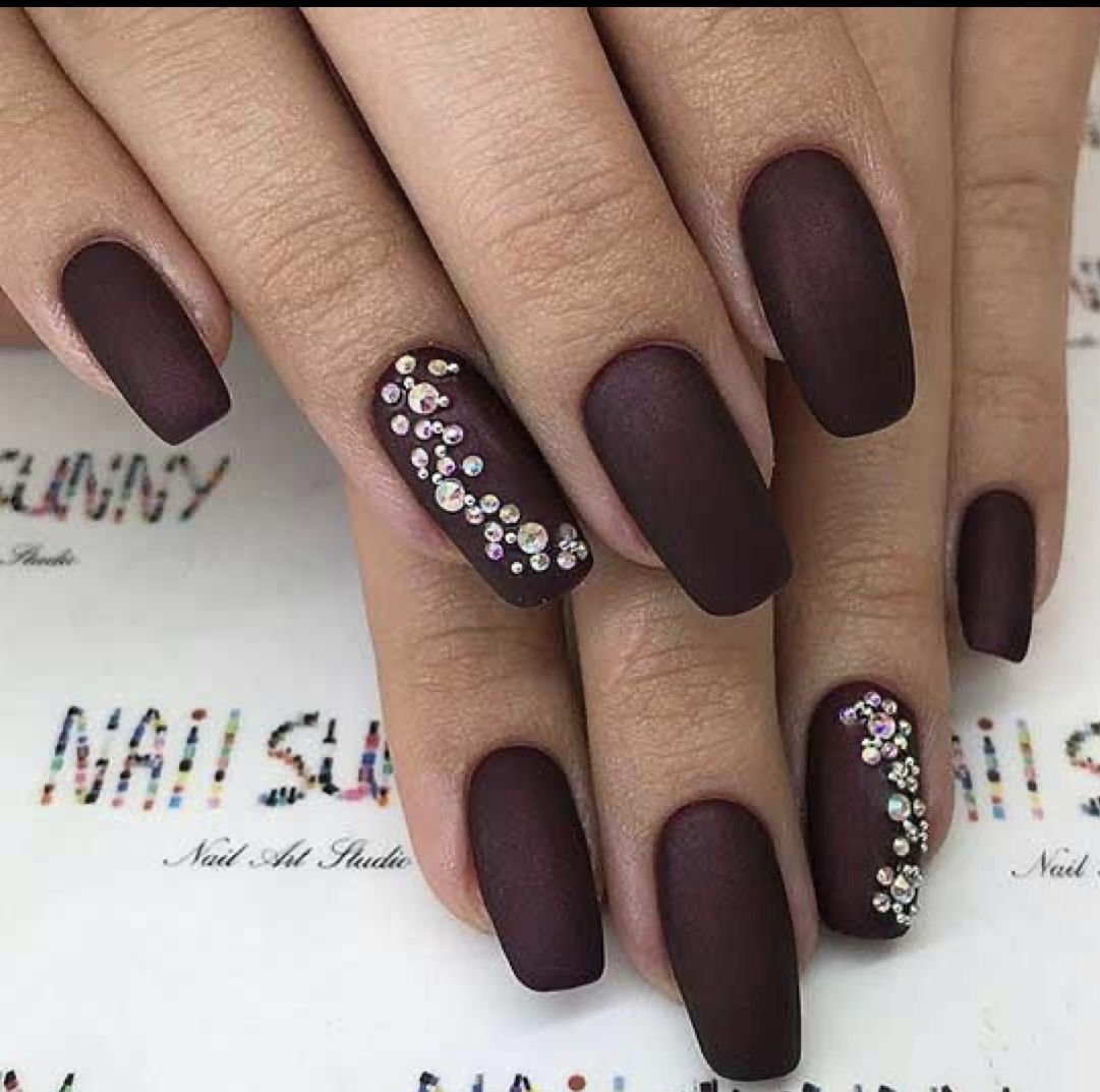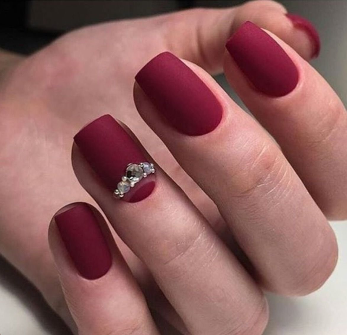 Матовый бордовый маникюр со стразами