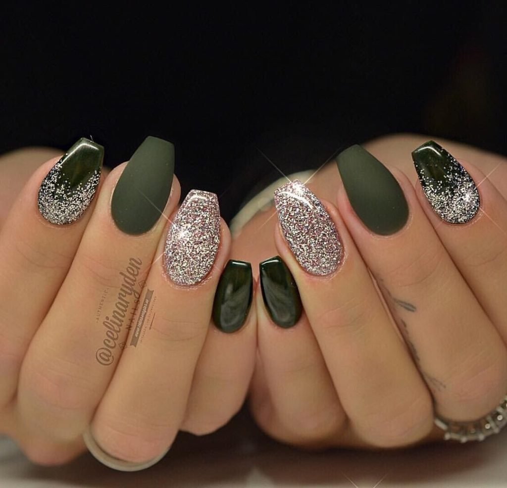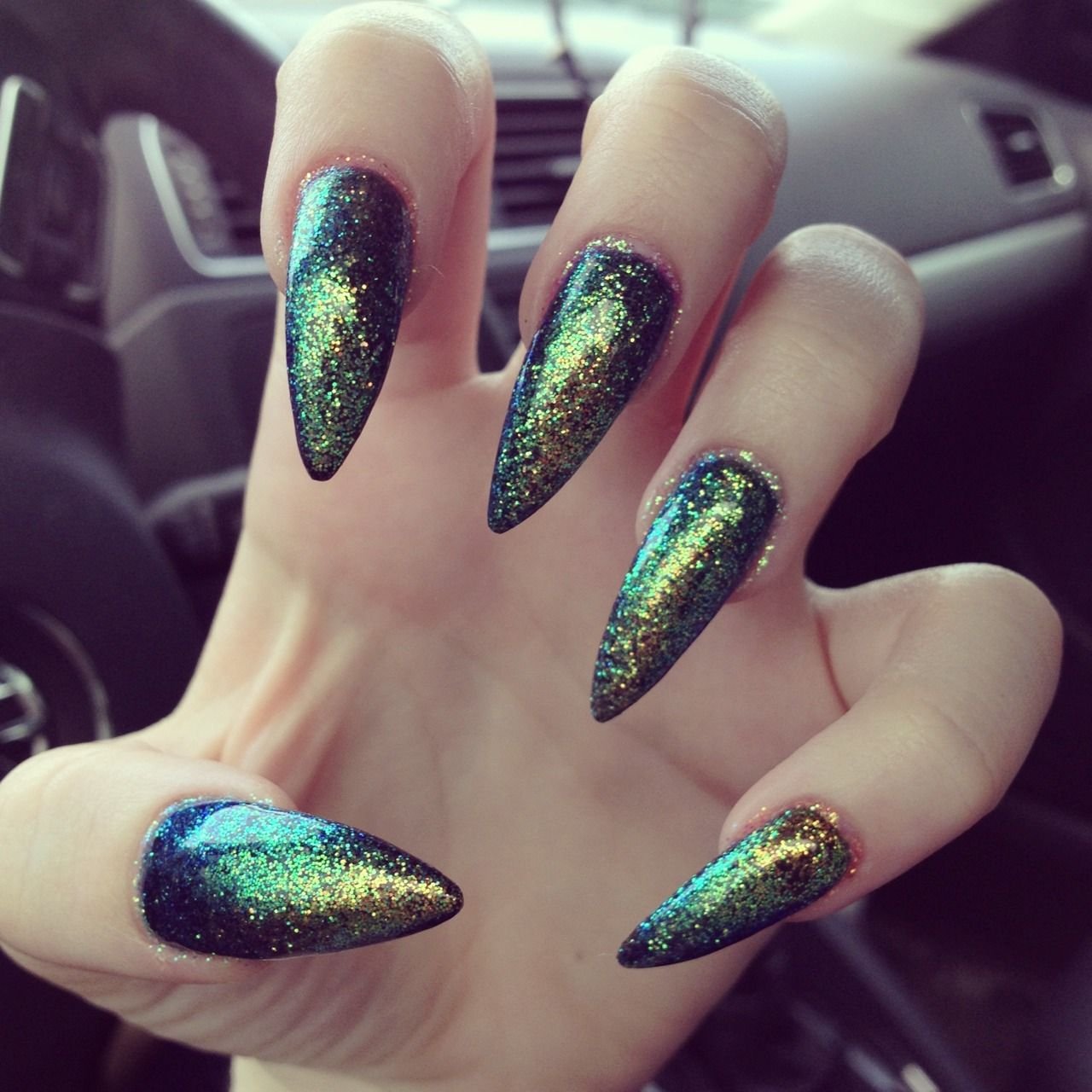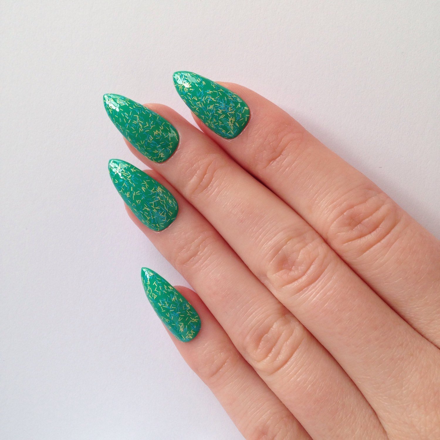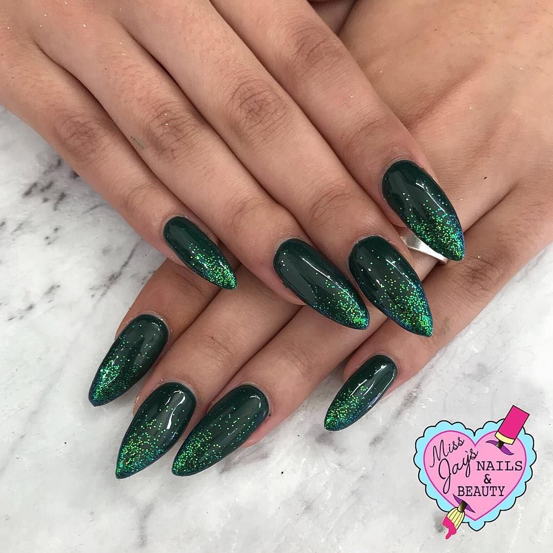 Зеленый с блестками маникюр острые