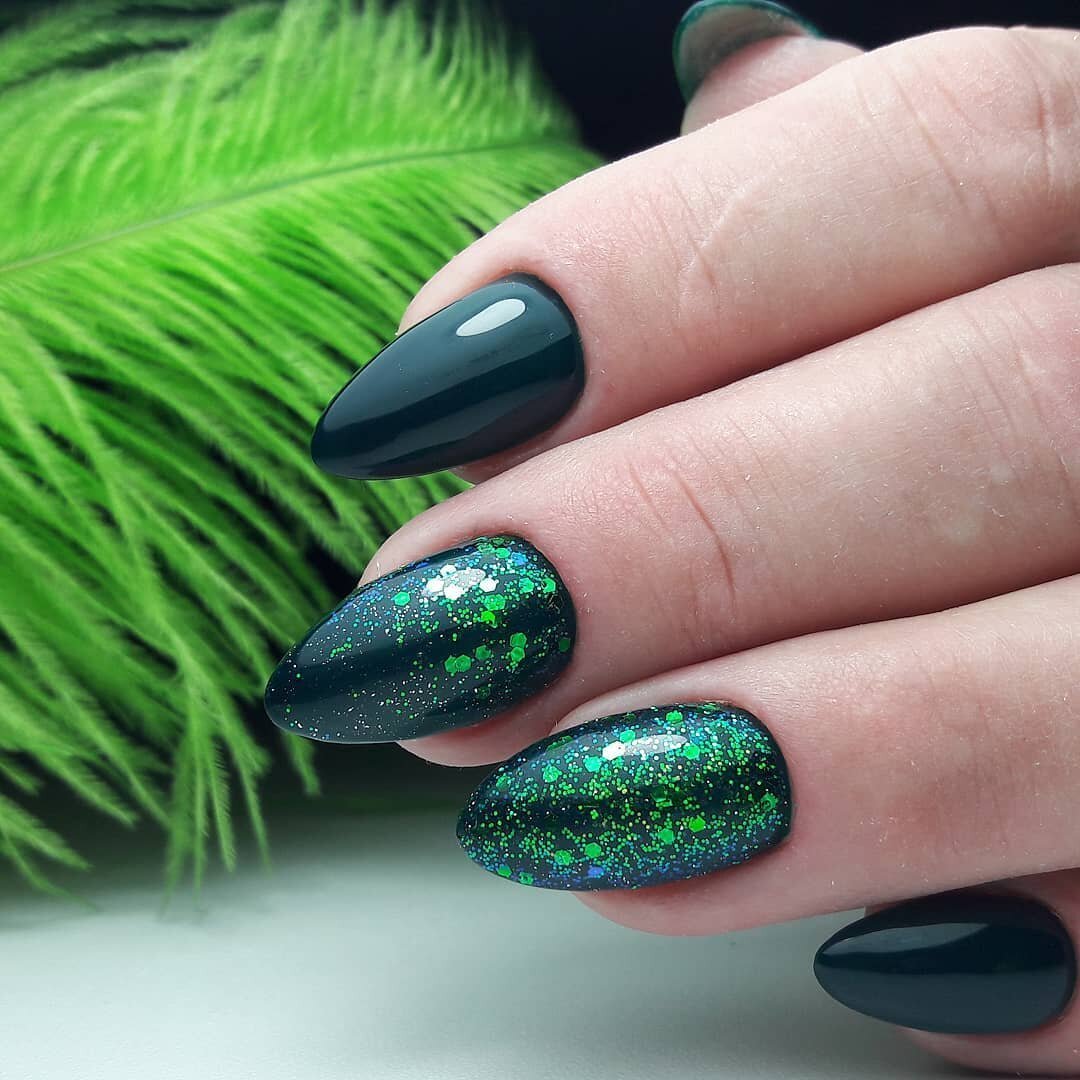 Зелёный маникюр с блестками миндаль