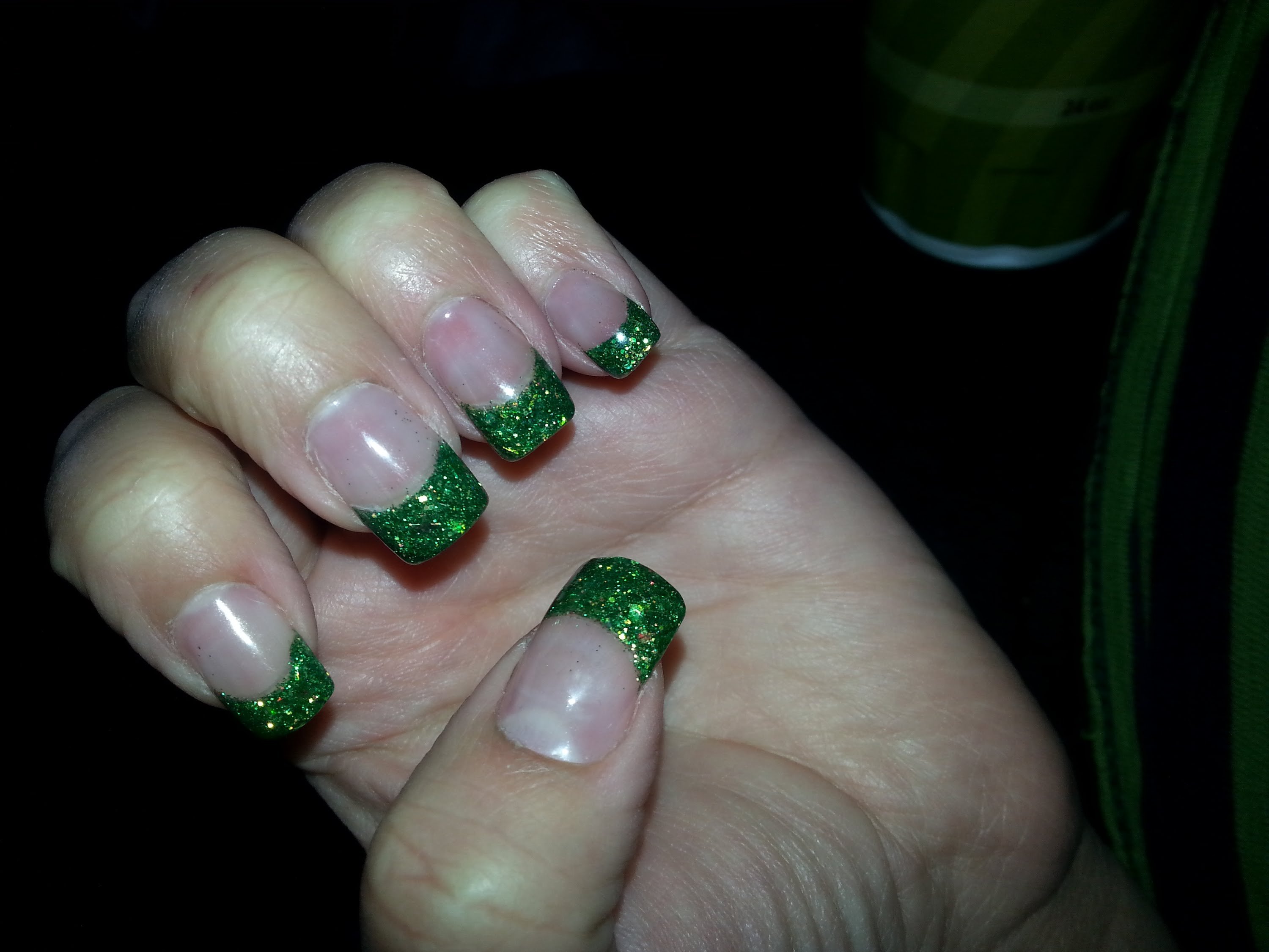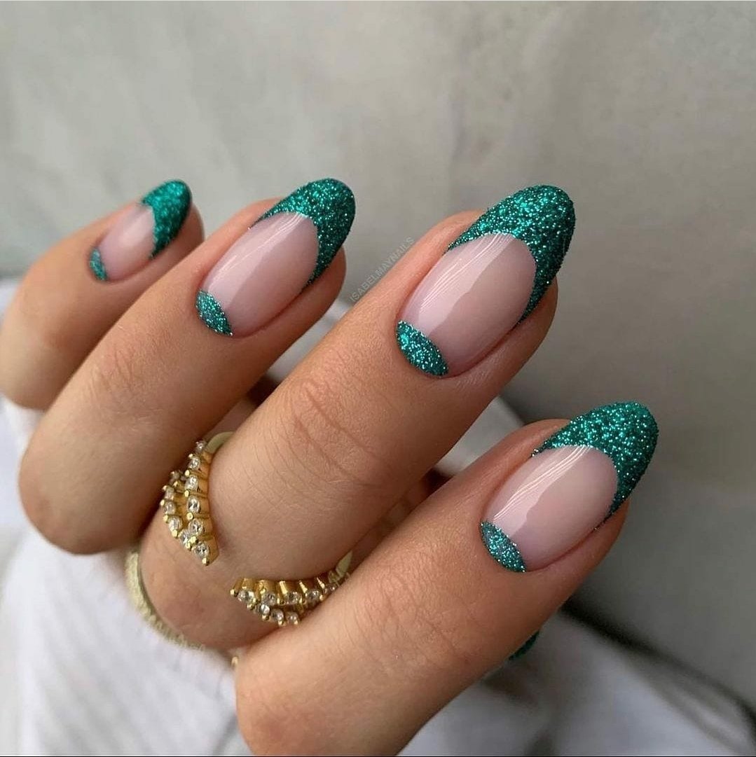 Маникюр френч зеленый с блестками