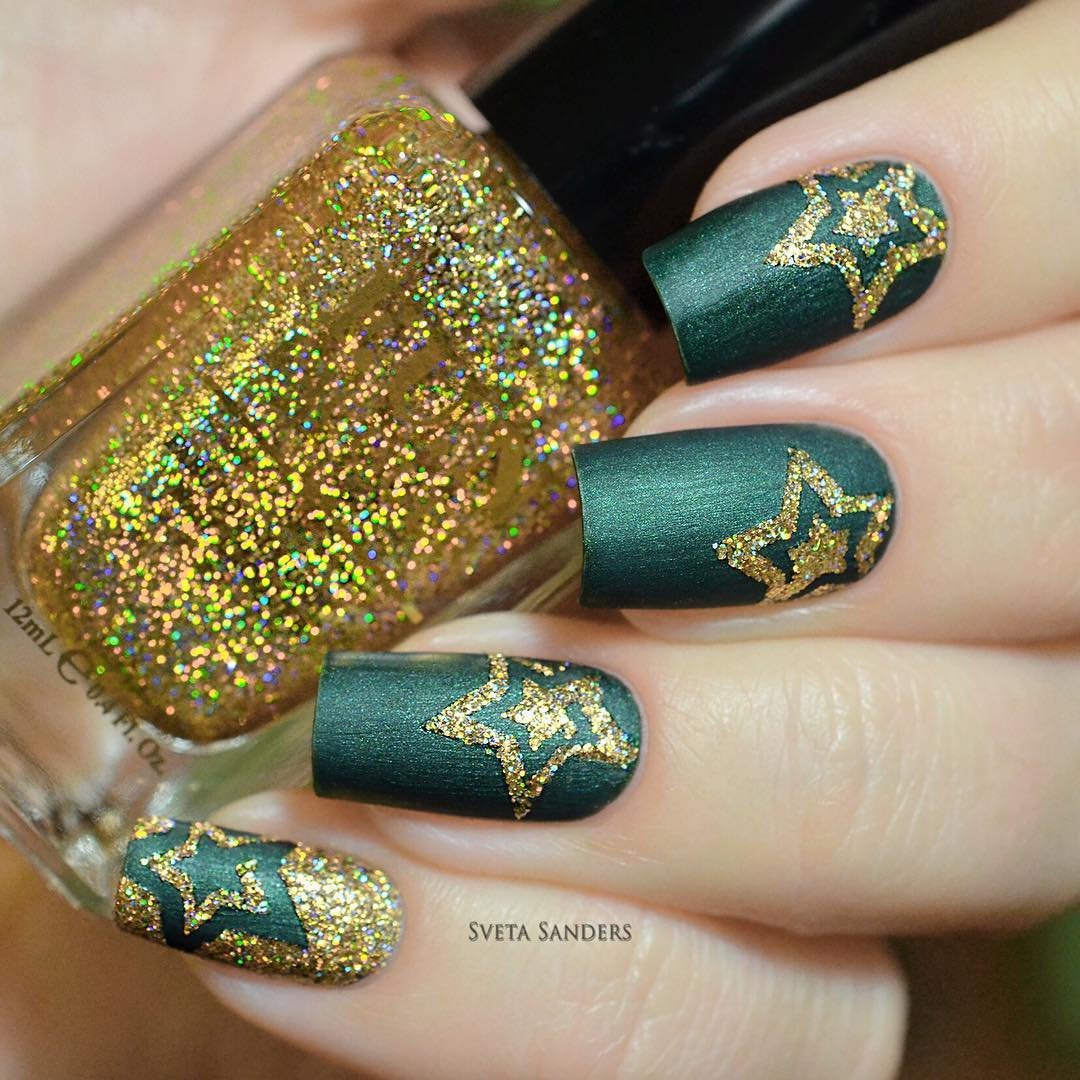 Новогодние ногти зеленые с золотым