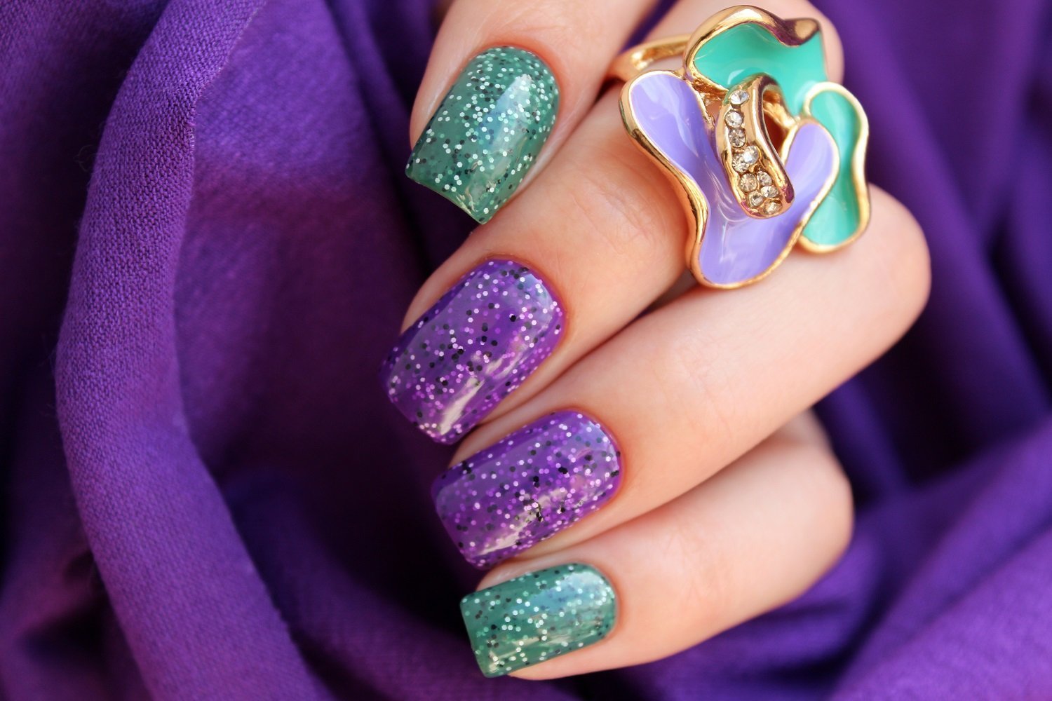 Изумрудный маникюр омбре с блестками