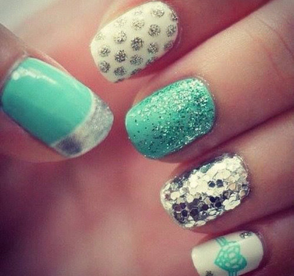Мятные ногти с блестками