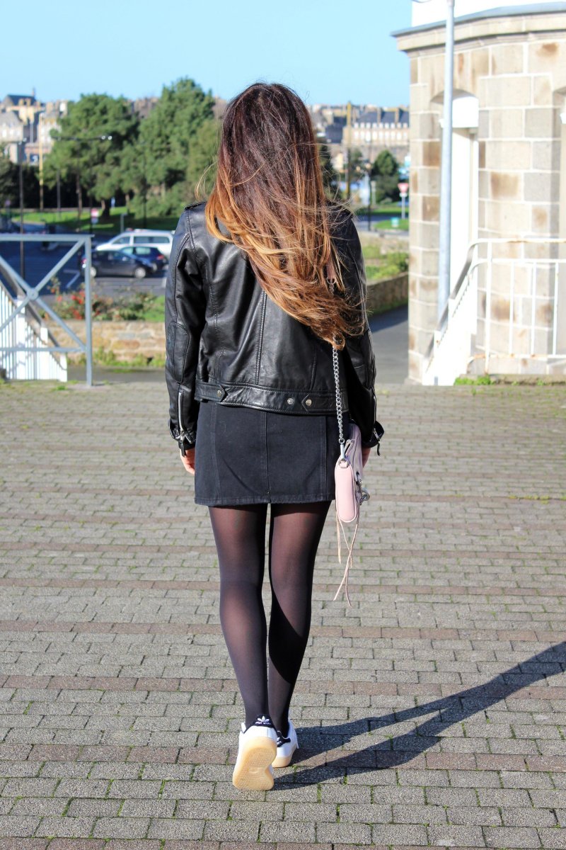 Кожаная юбка с черными колготками