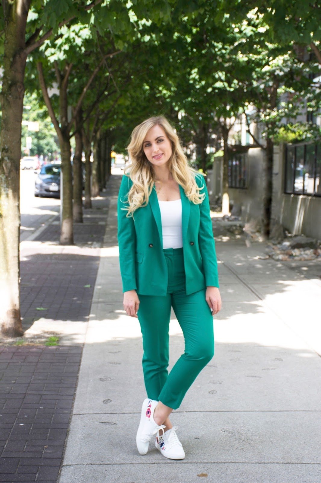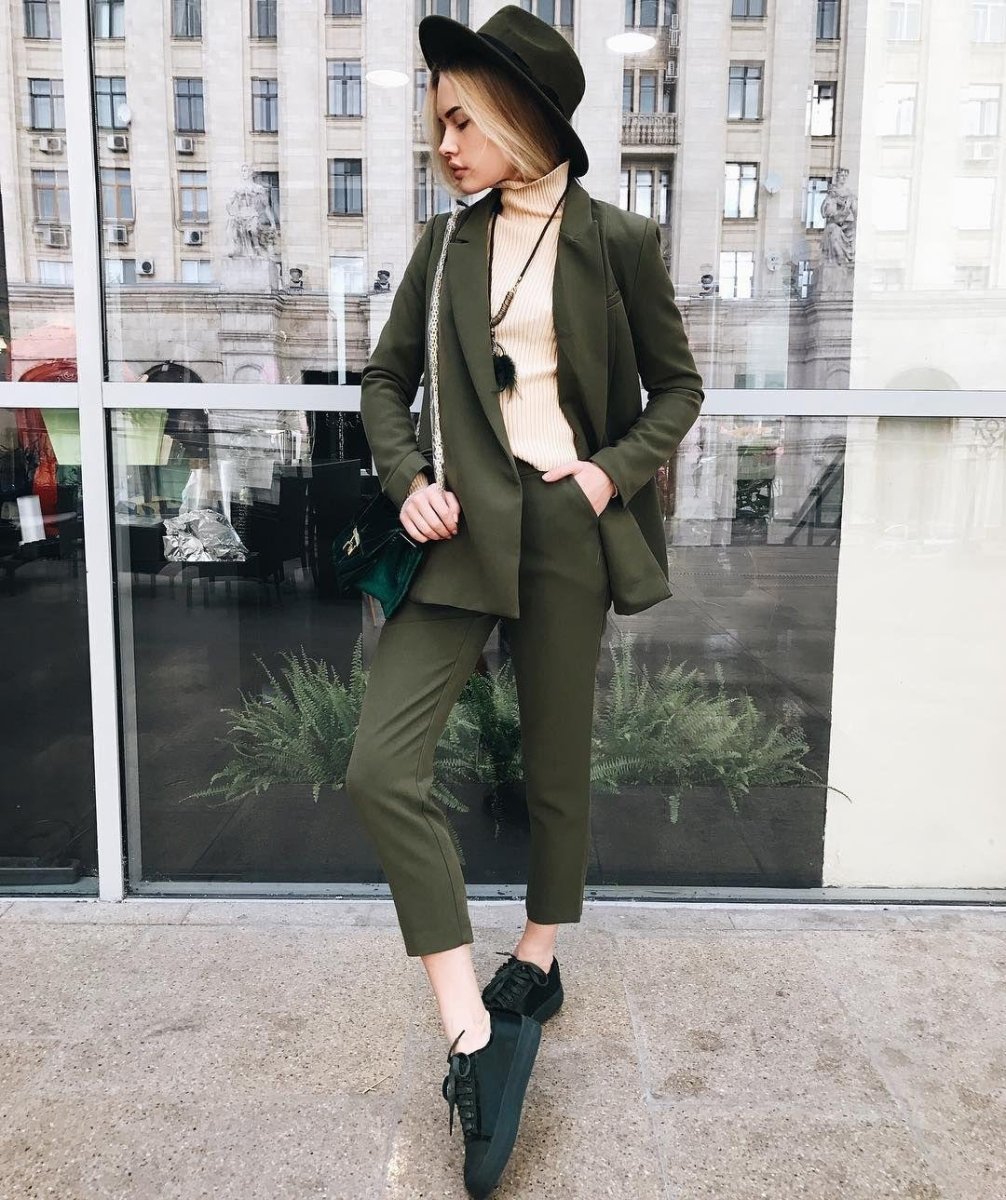 Образ с зеленым брючным костюмом