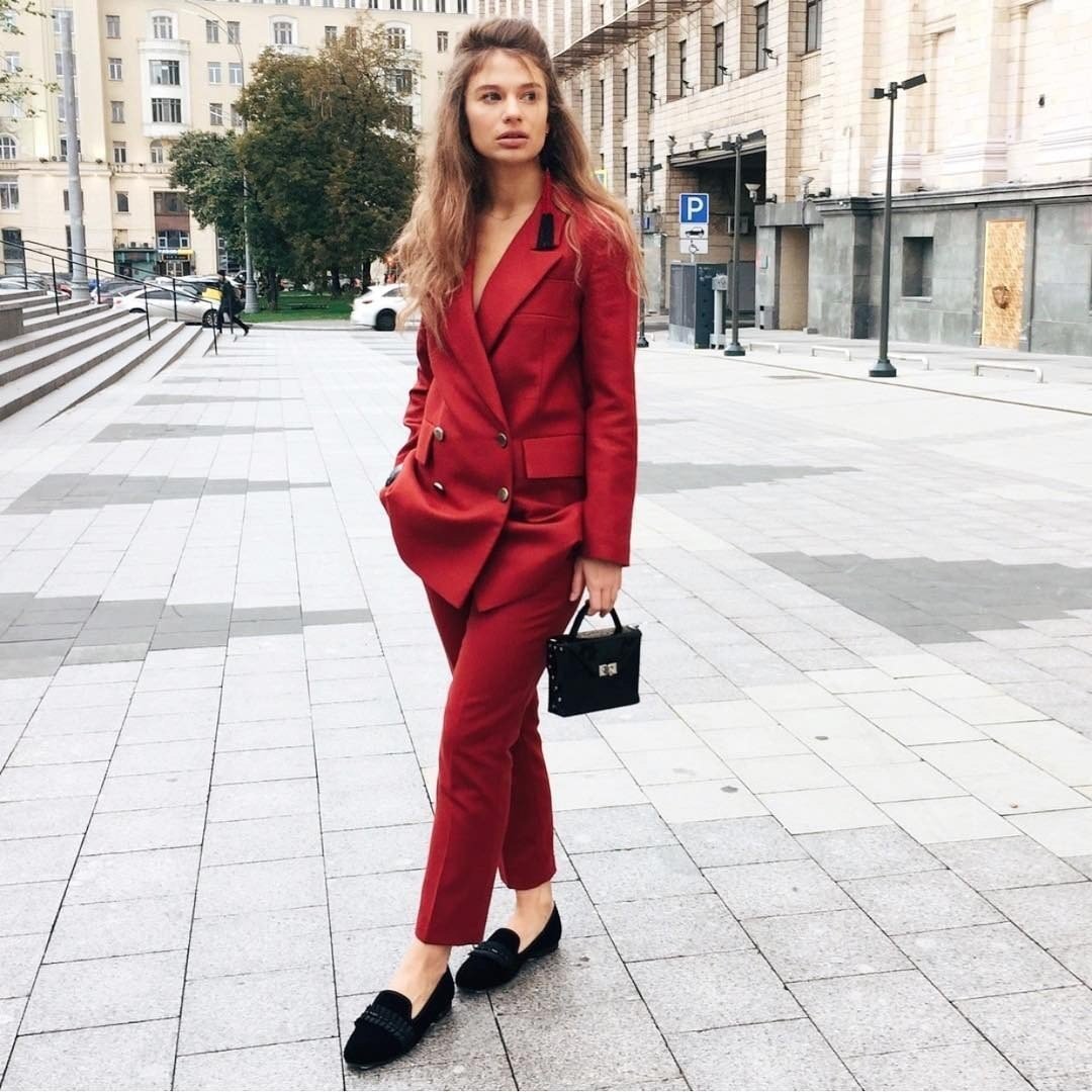 Красный брючный костюм образ