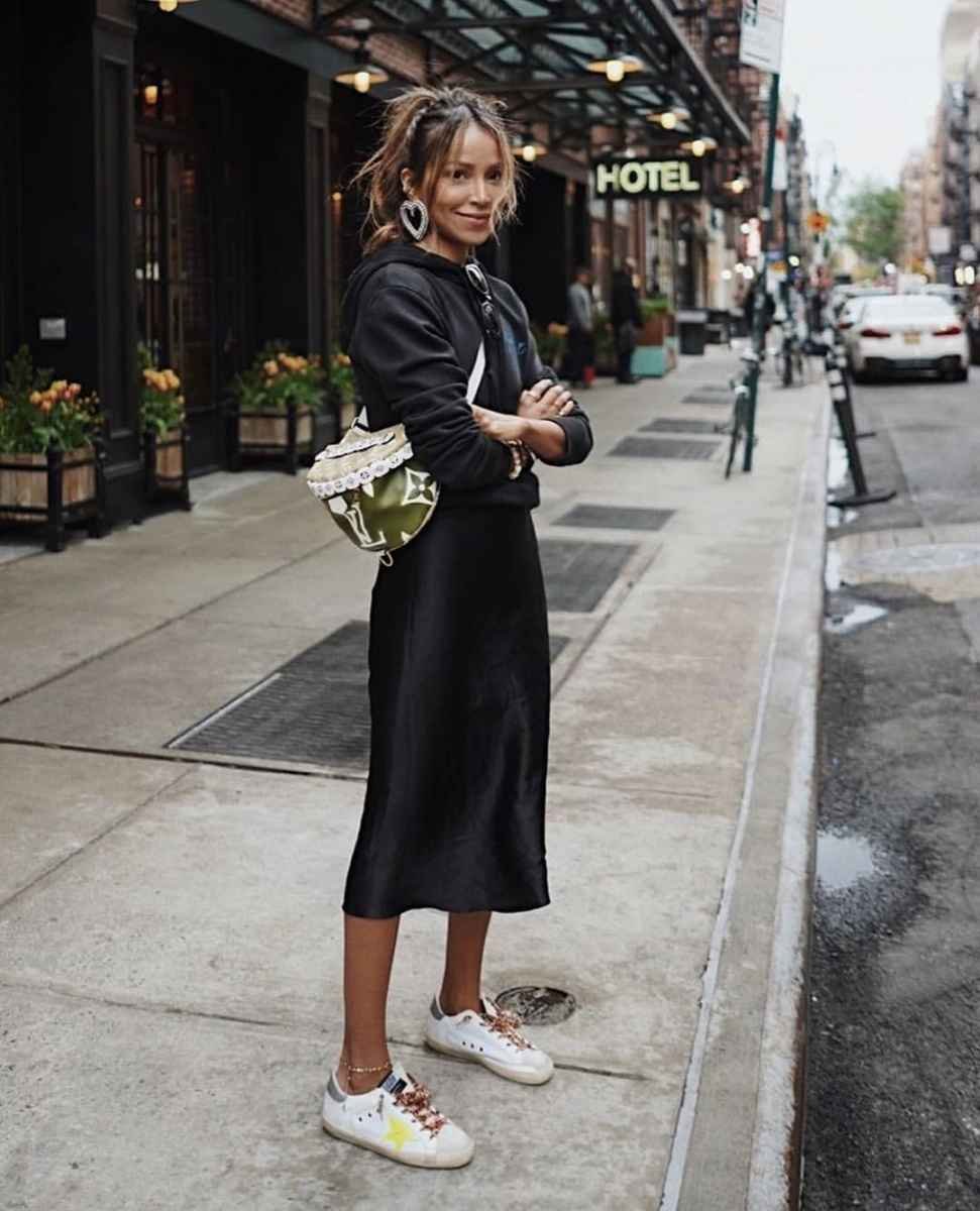 Черная атласная юбка с кроссовками
