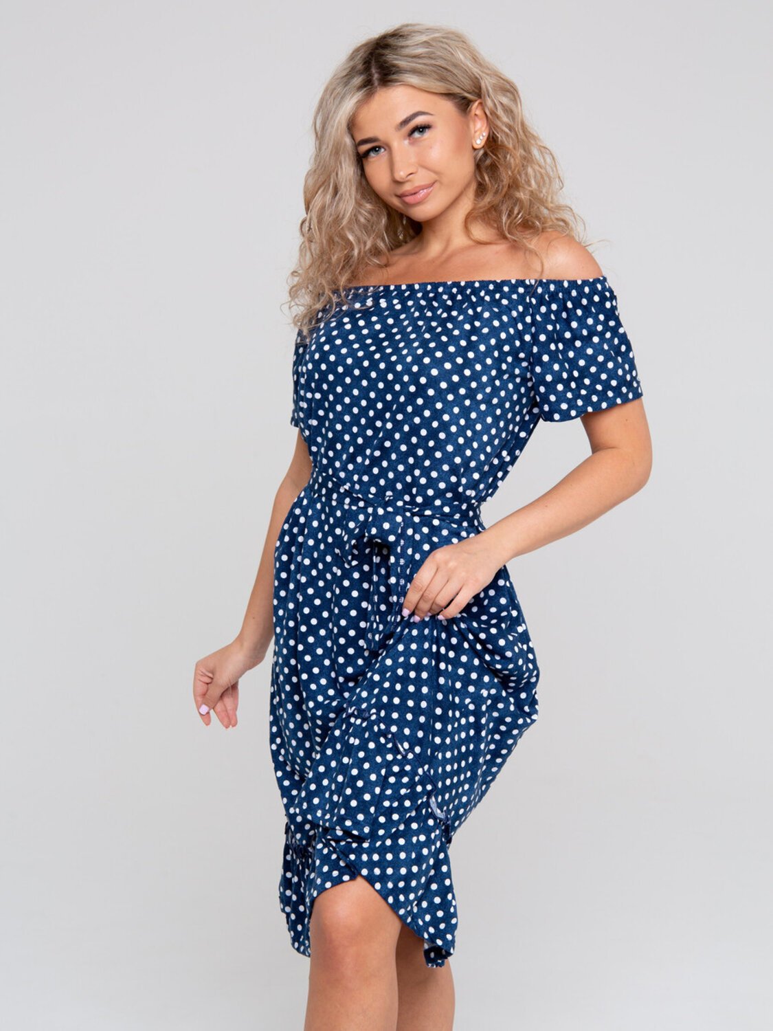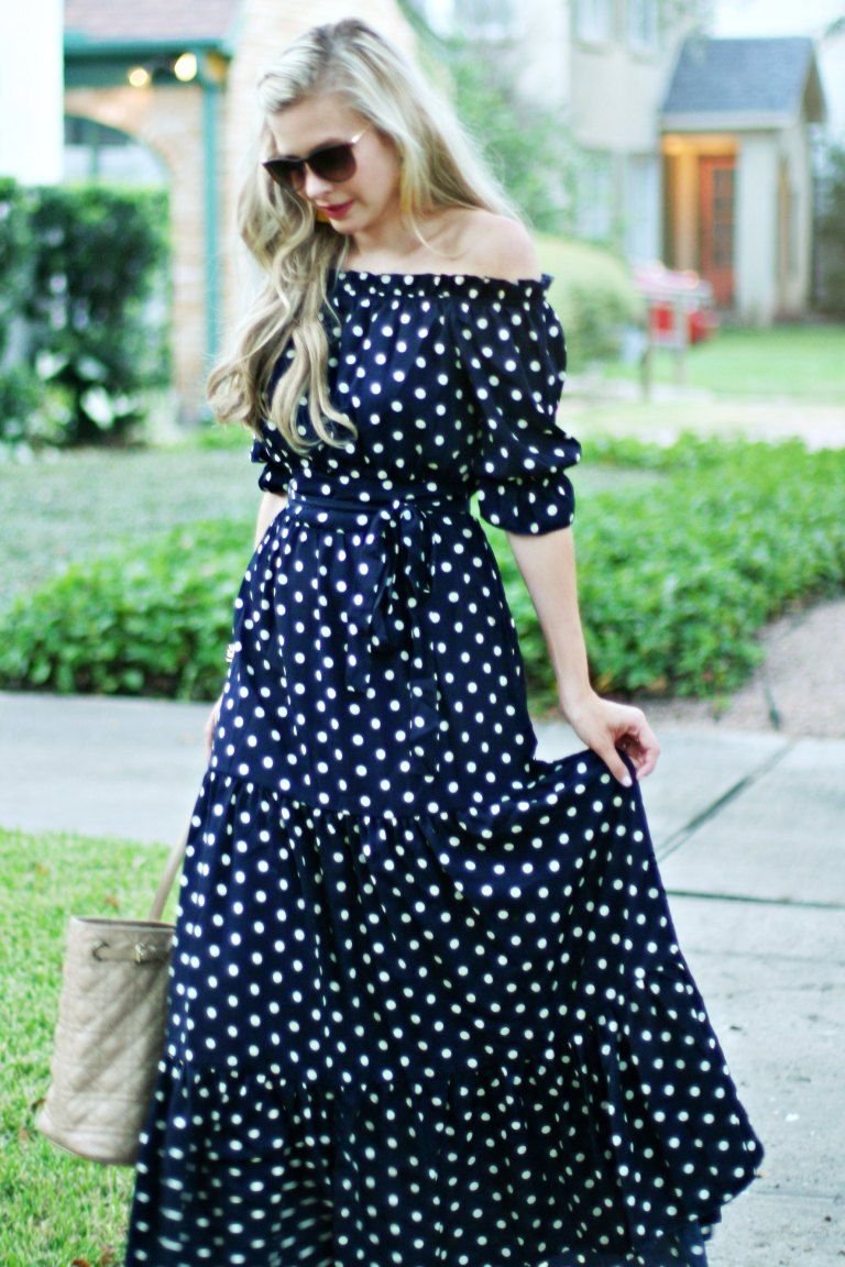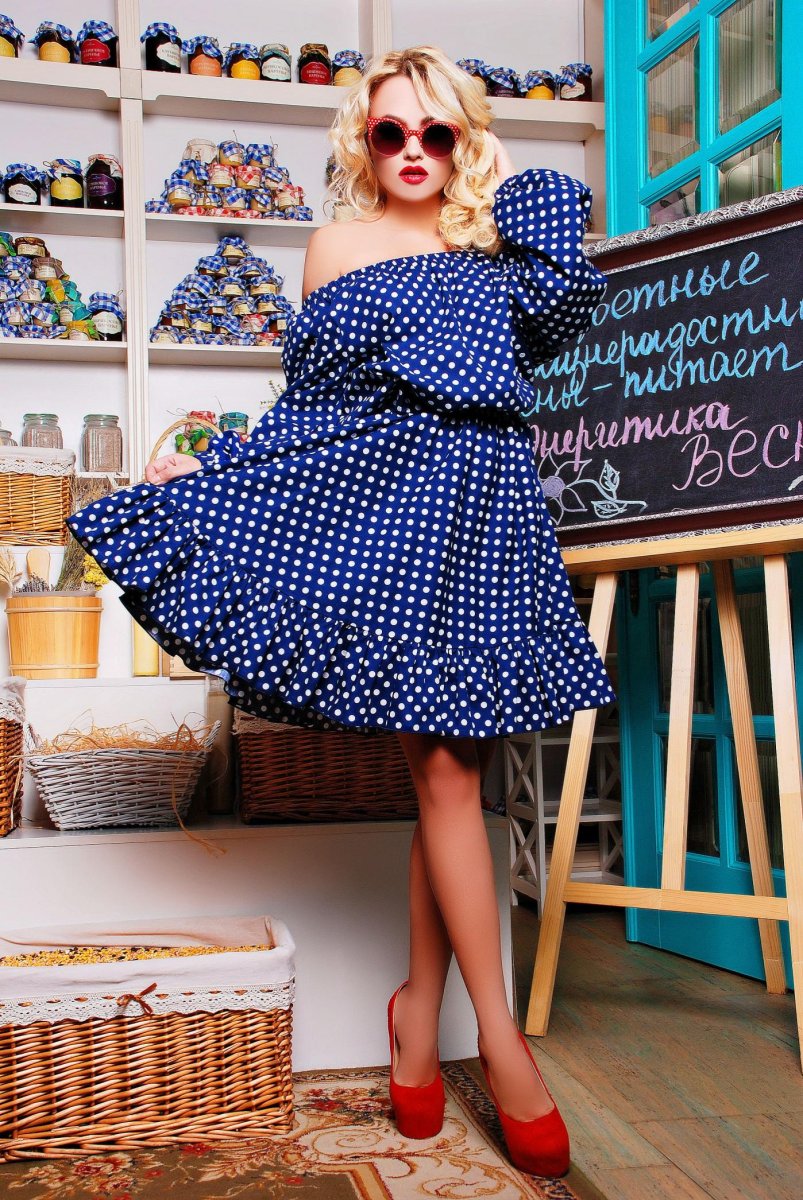 Платье в горох со спущенными плечами