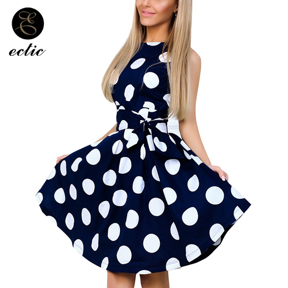 Синее платье в горошек с красным поясом