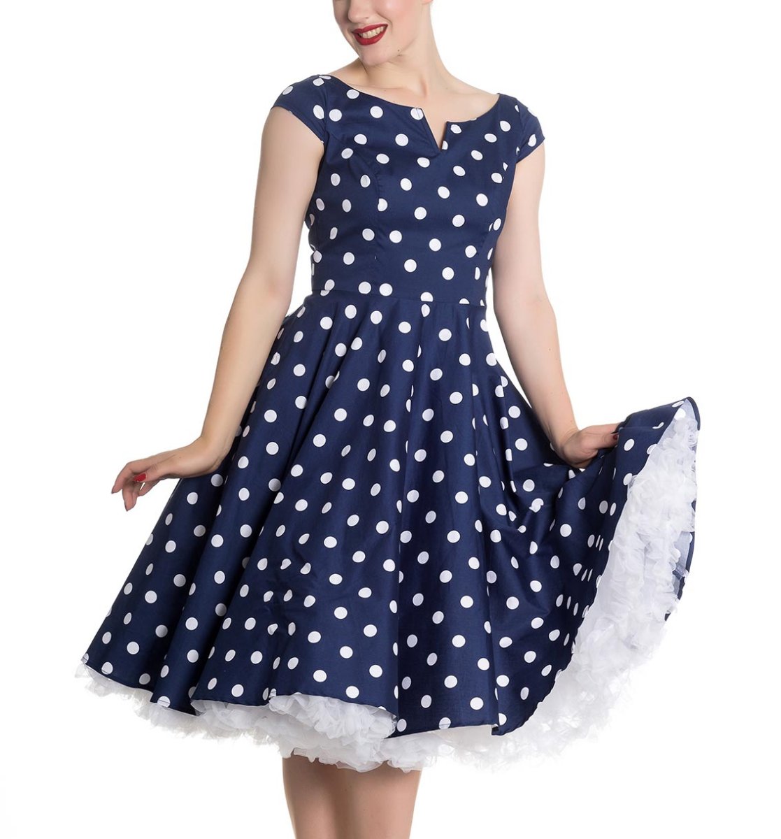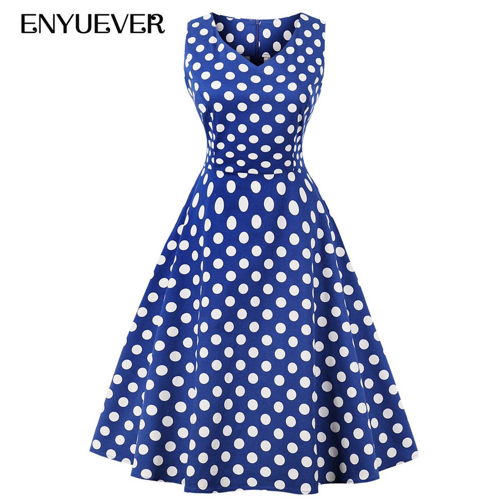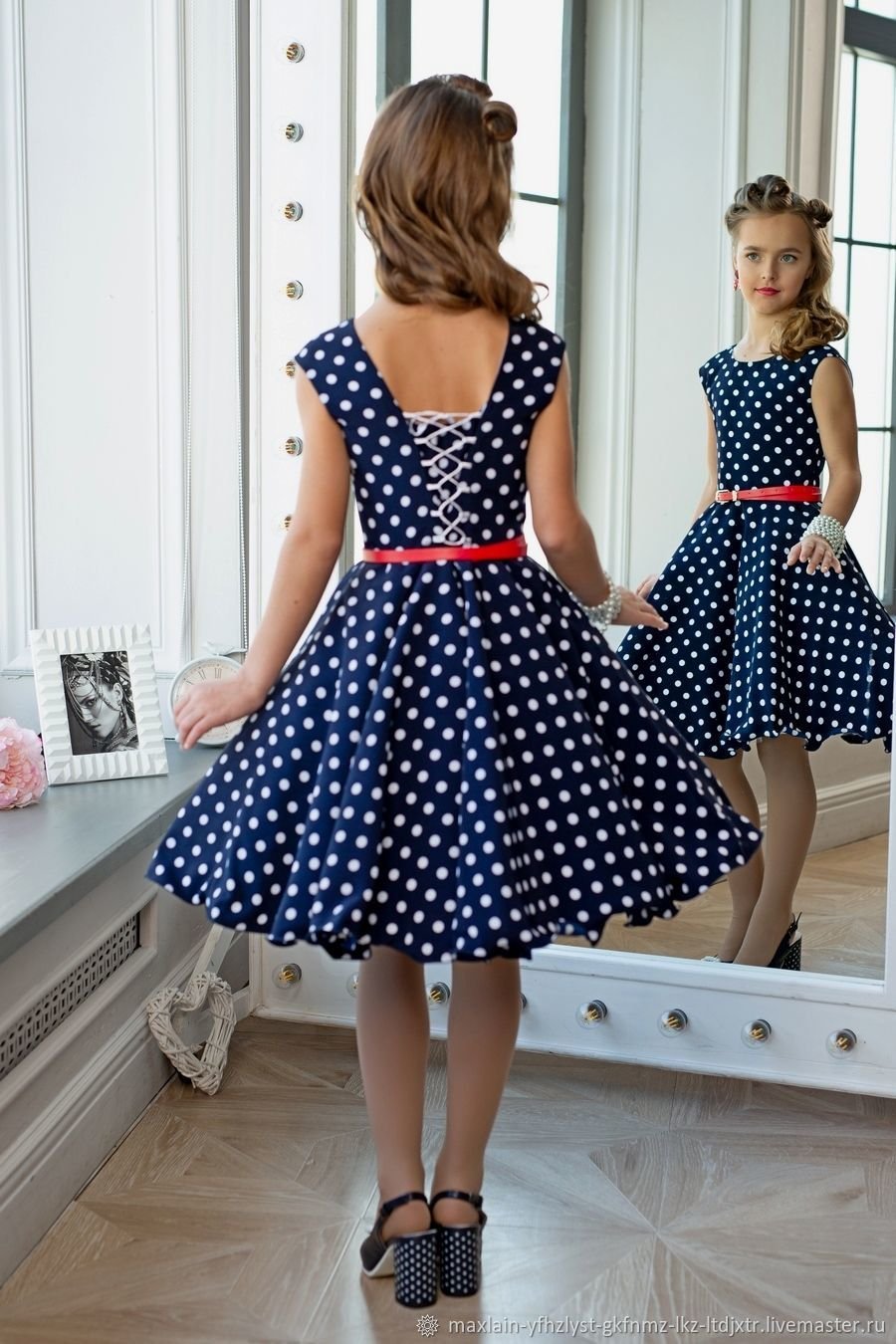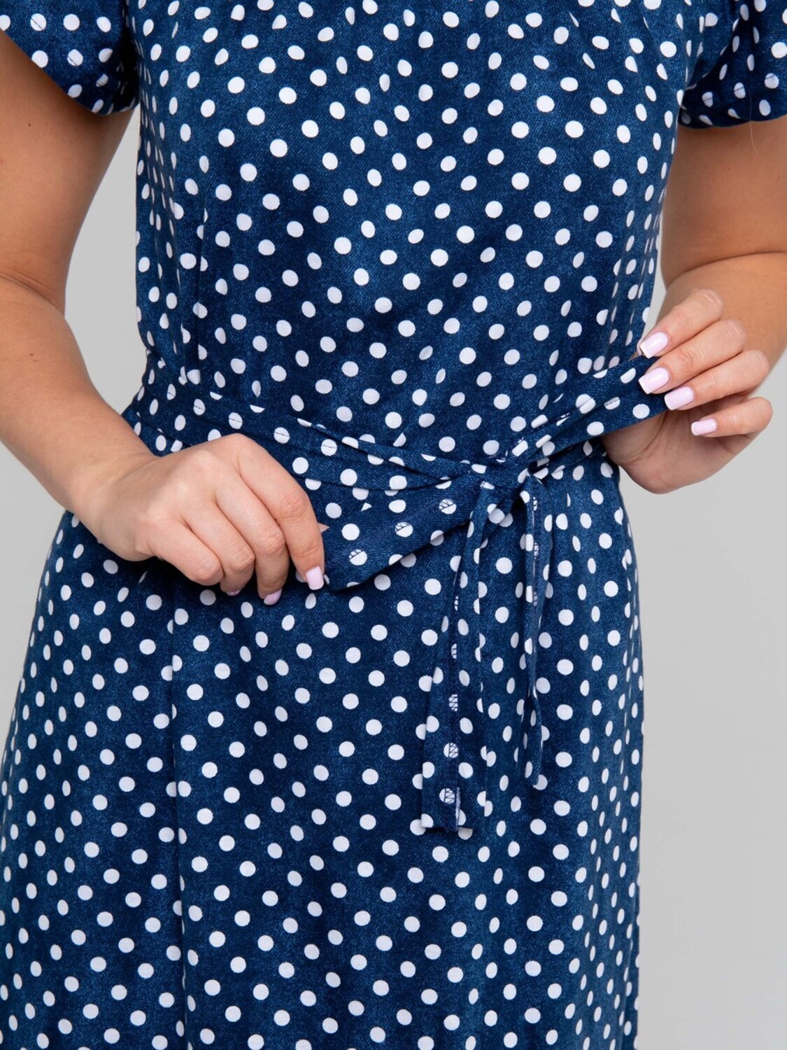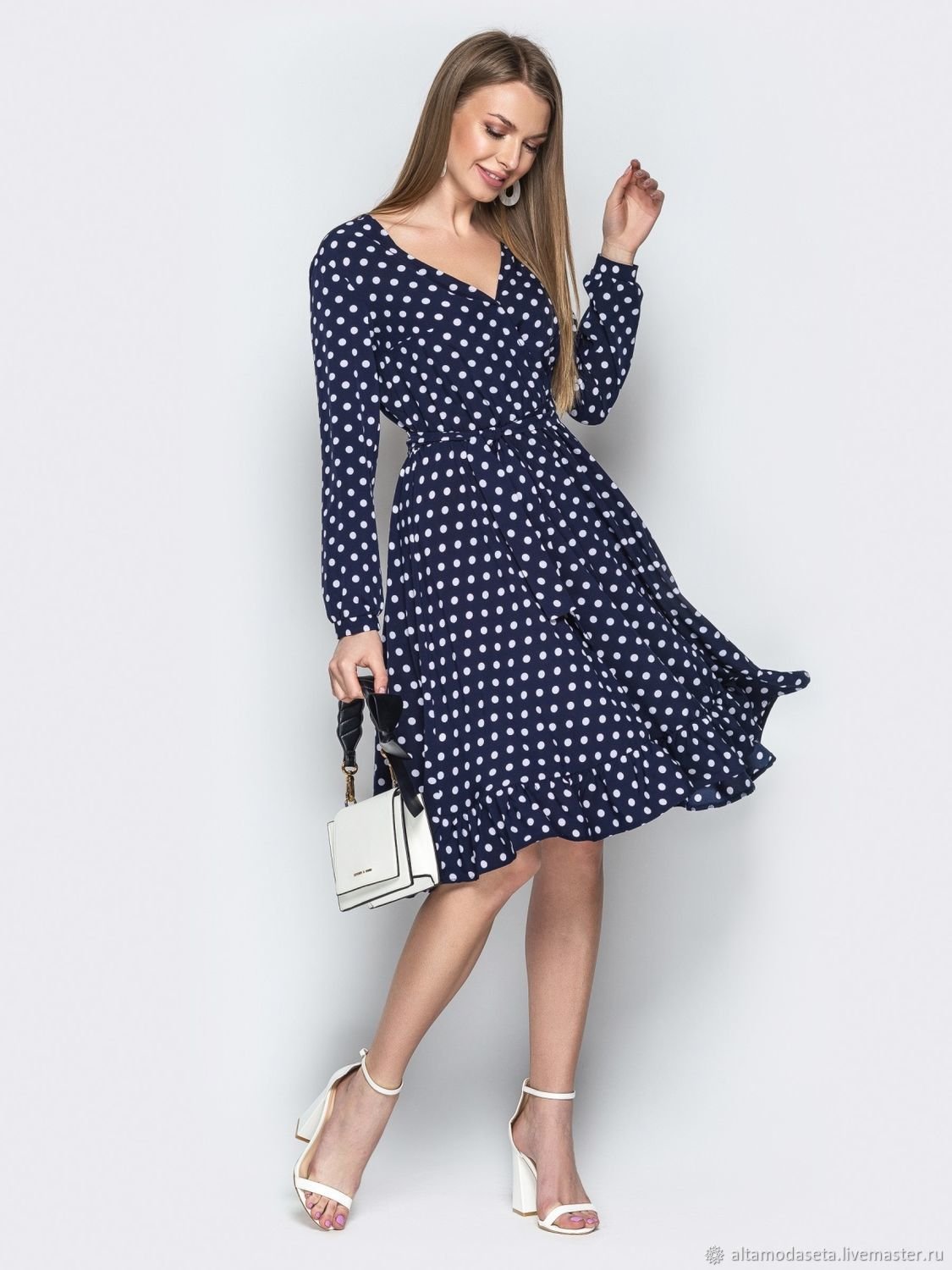 Синее платье в белый горошек