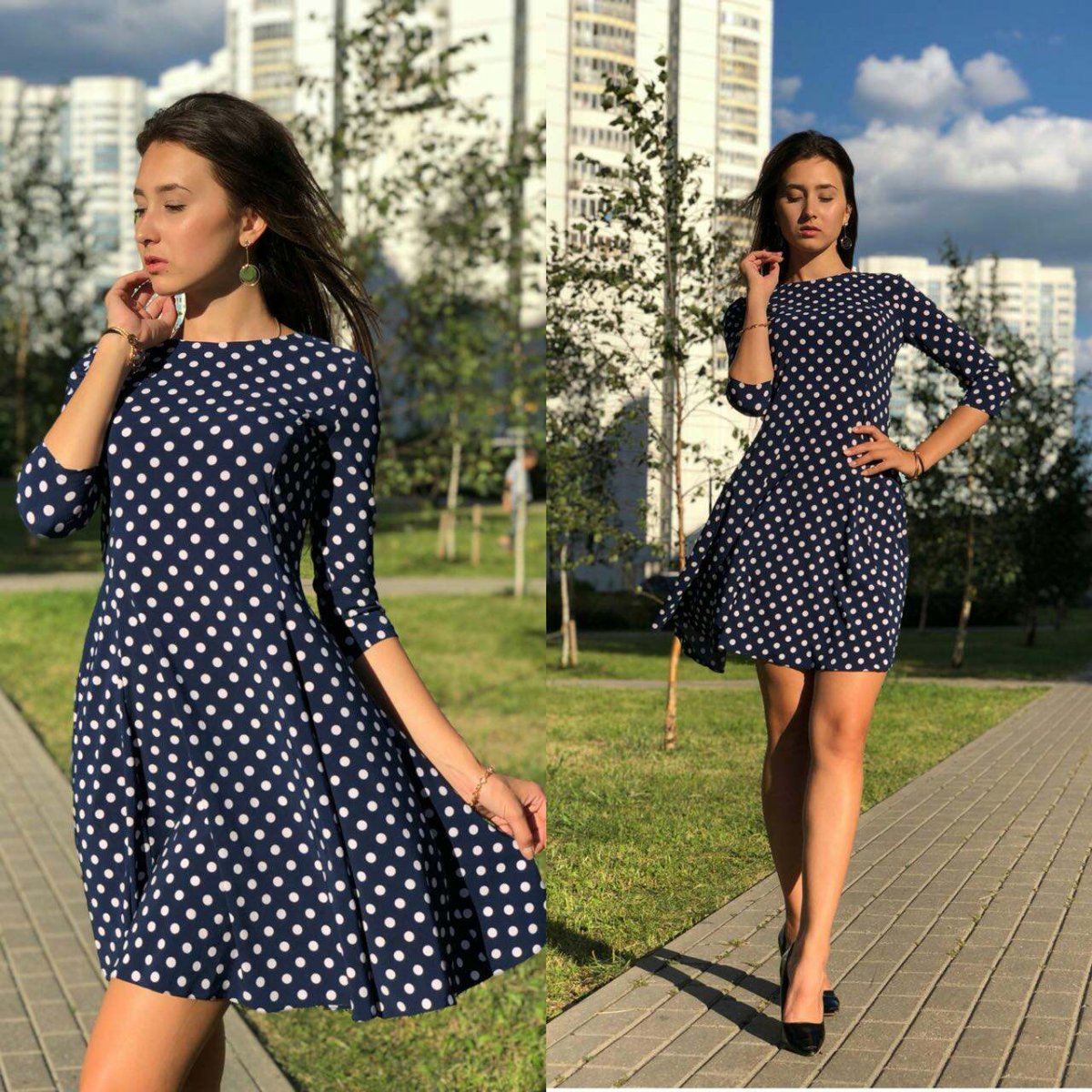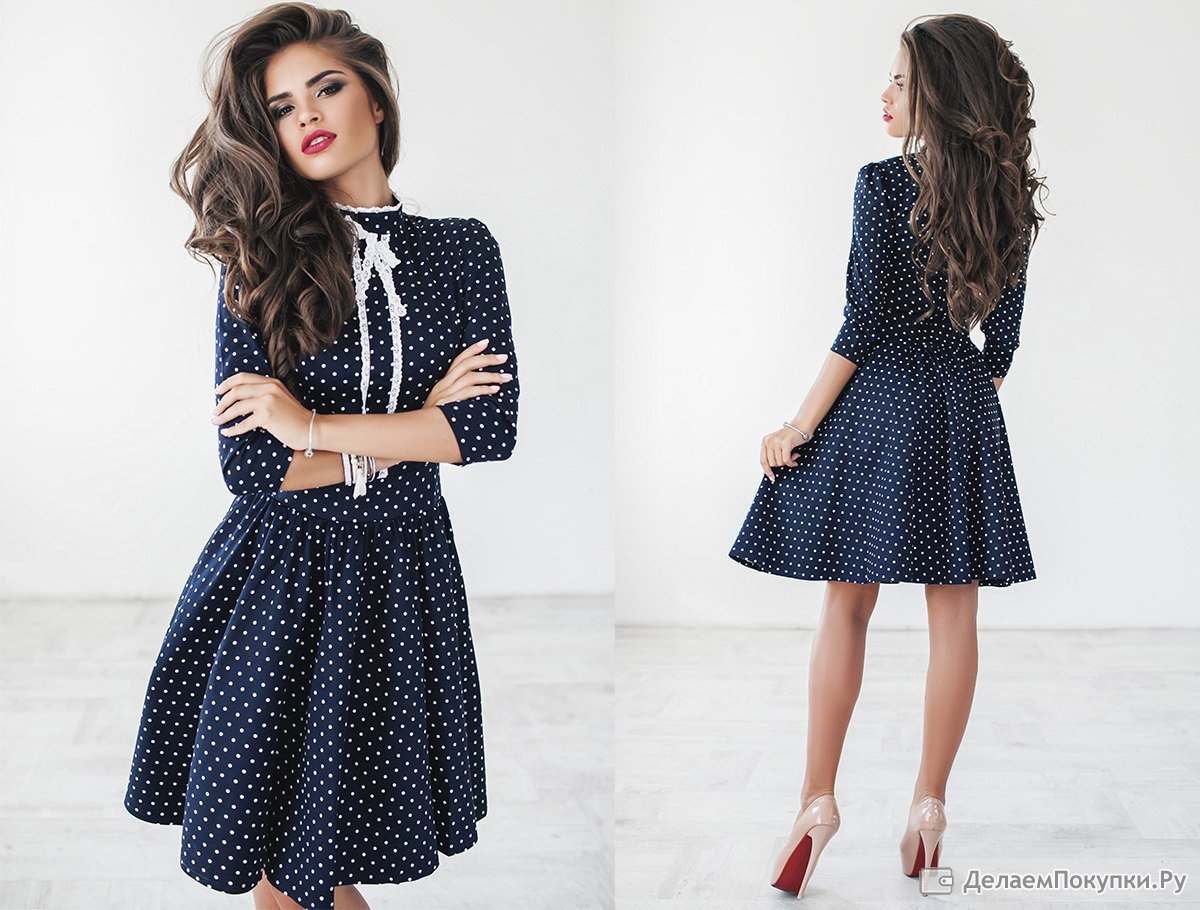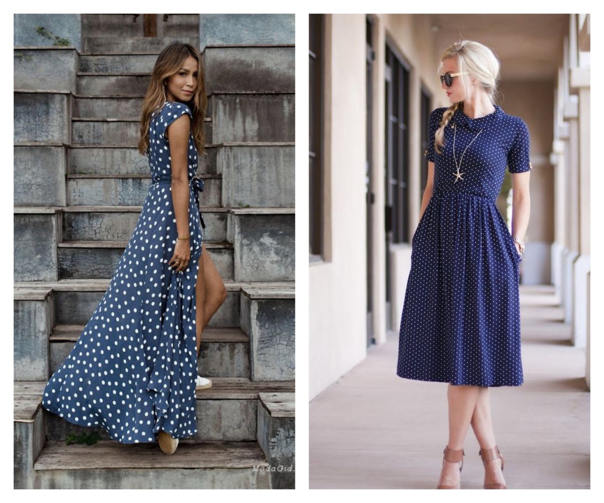 Луки с синим платьем в горошек