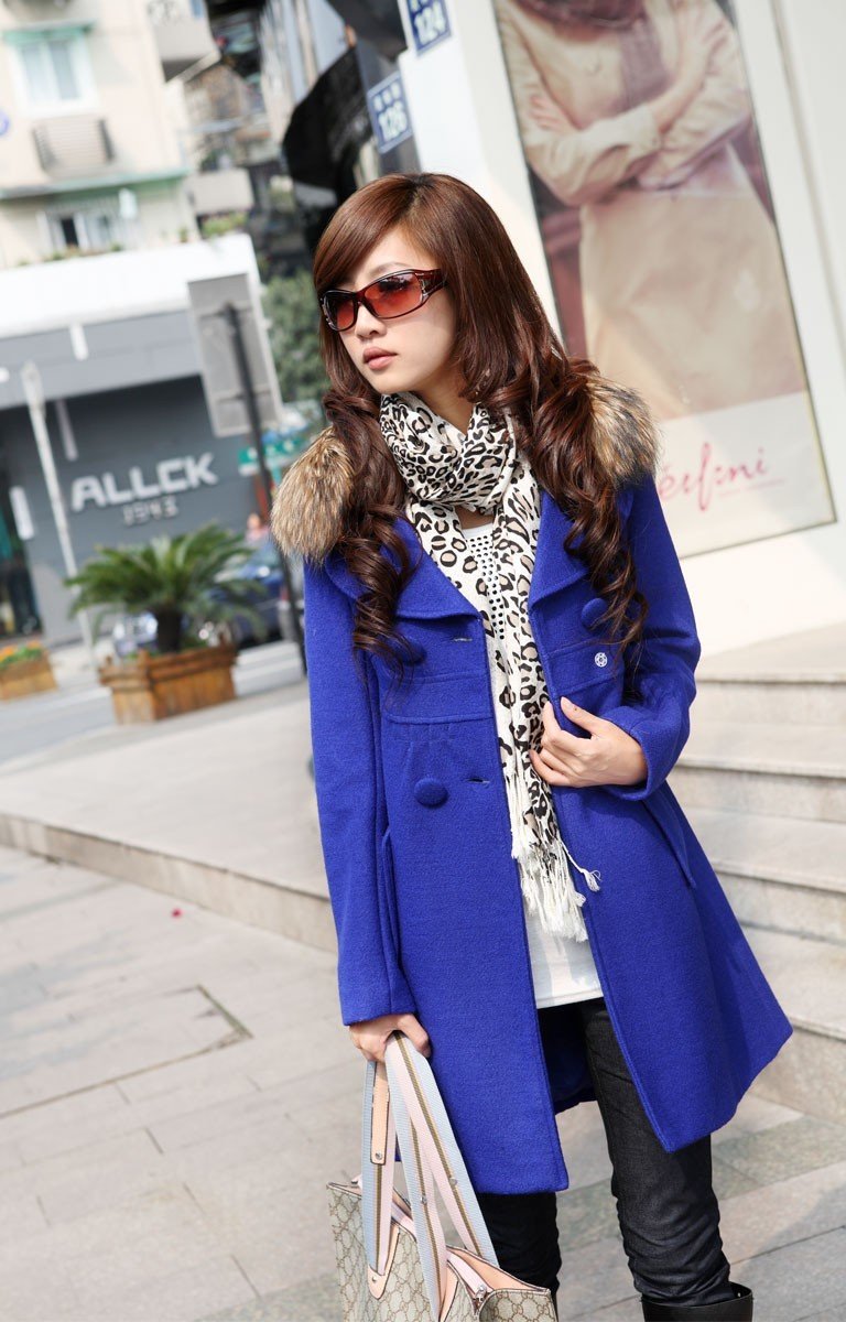 Девушка в синем пальто на голубом фоне