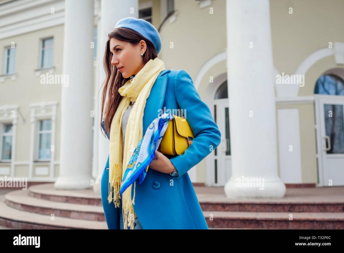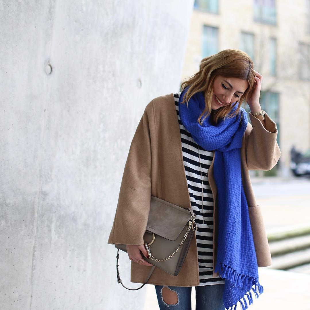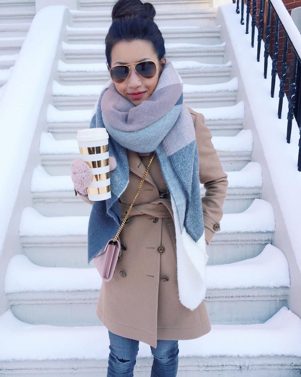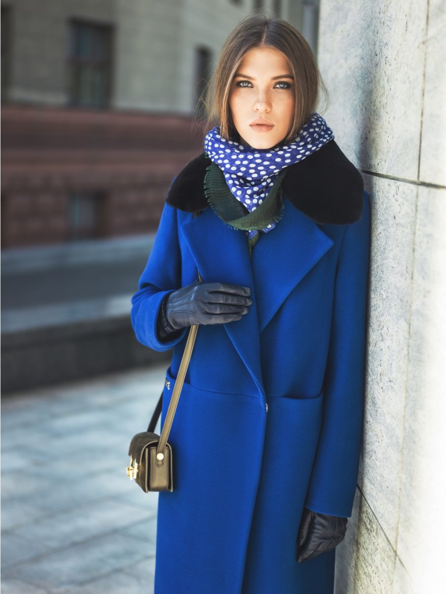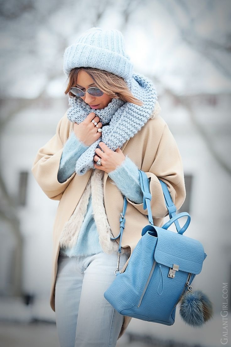 Голубой шарф к бежевой шубе фото женский