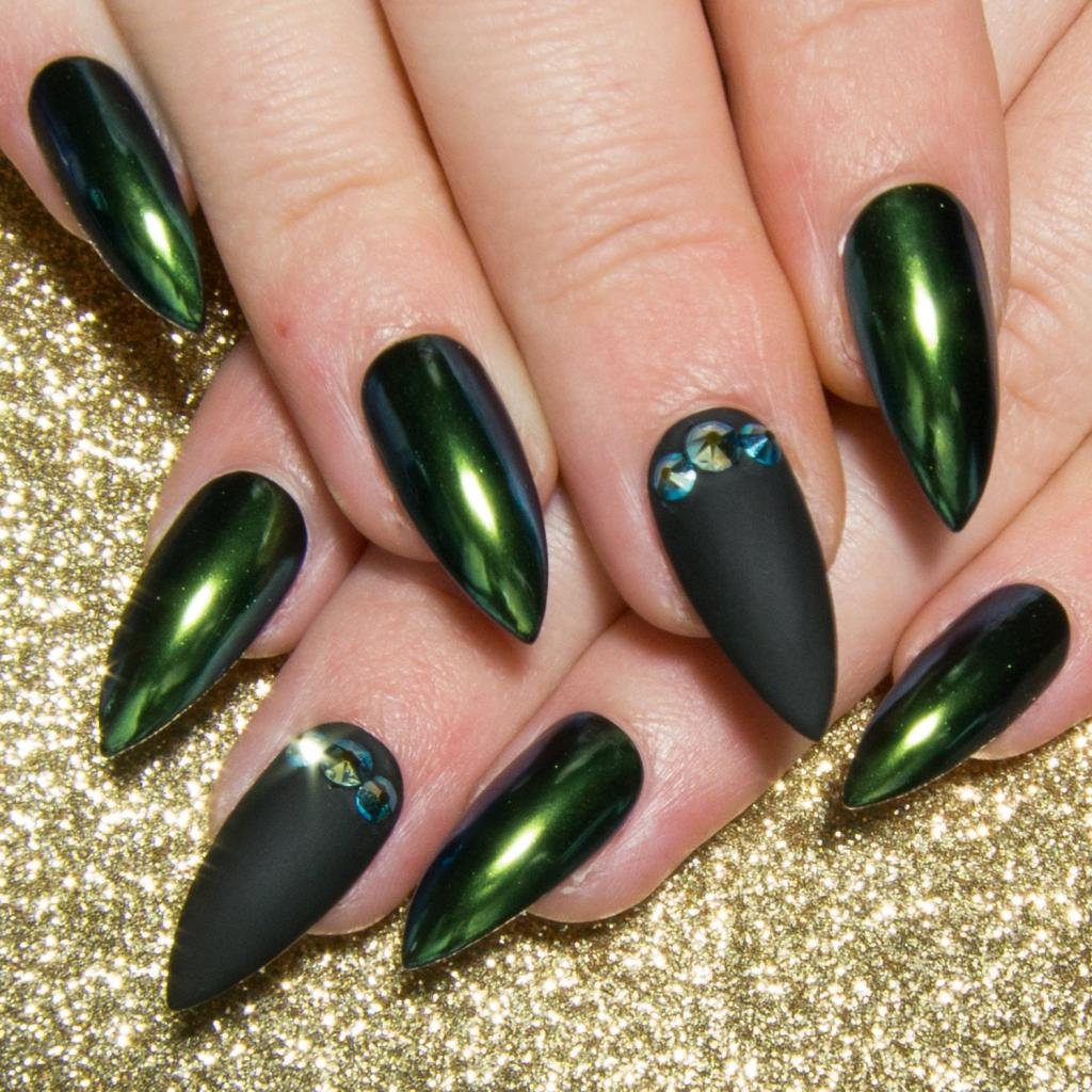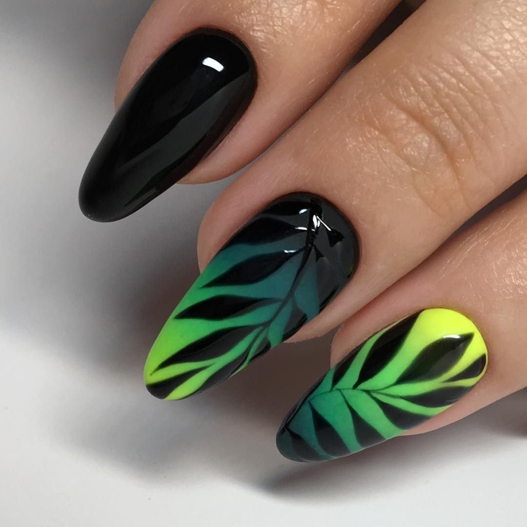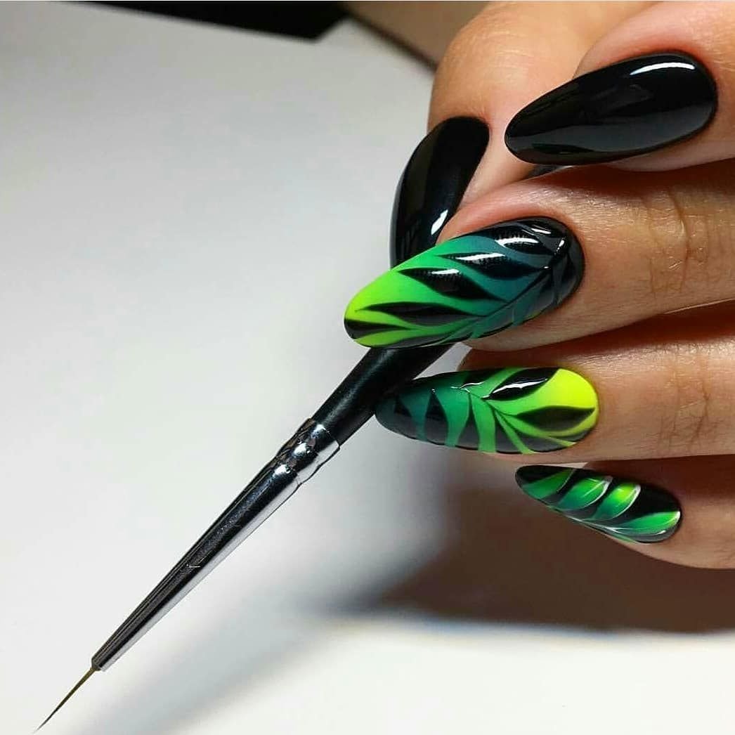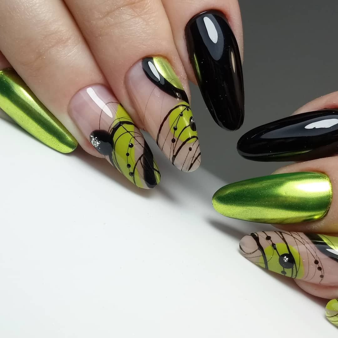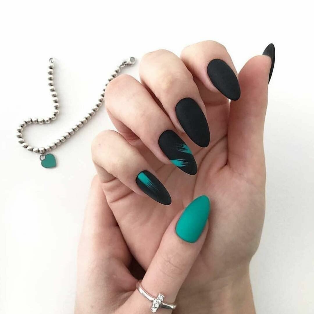 Маникюр на острые ногти черный с зеленым