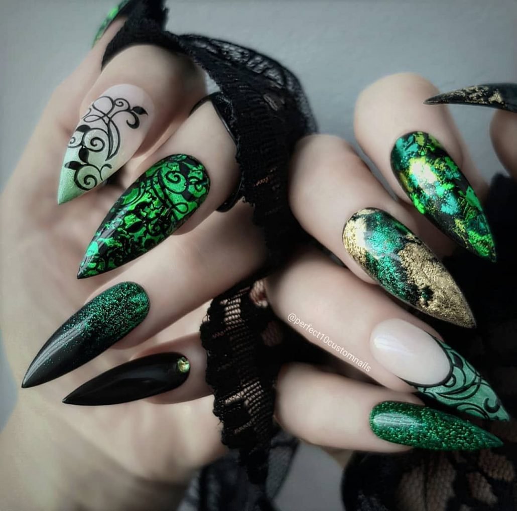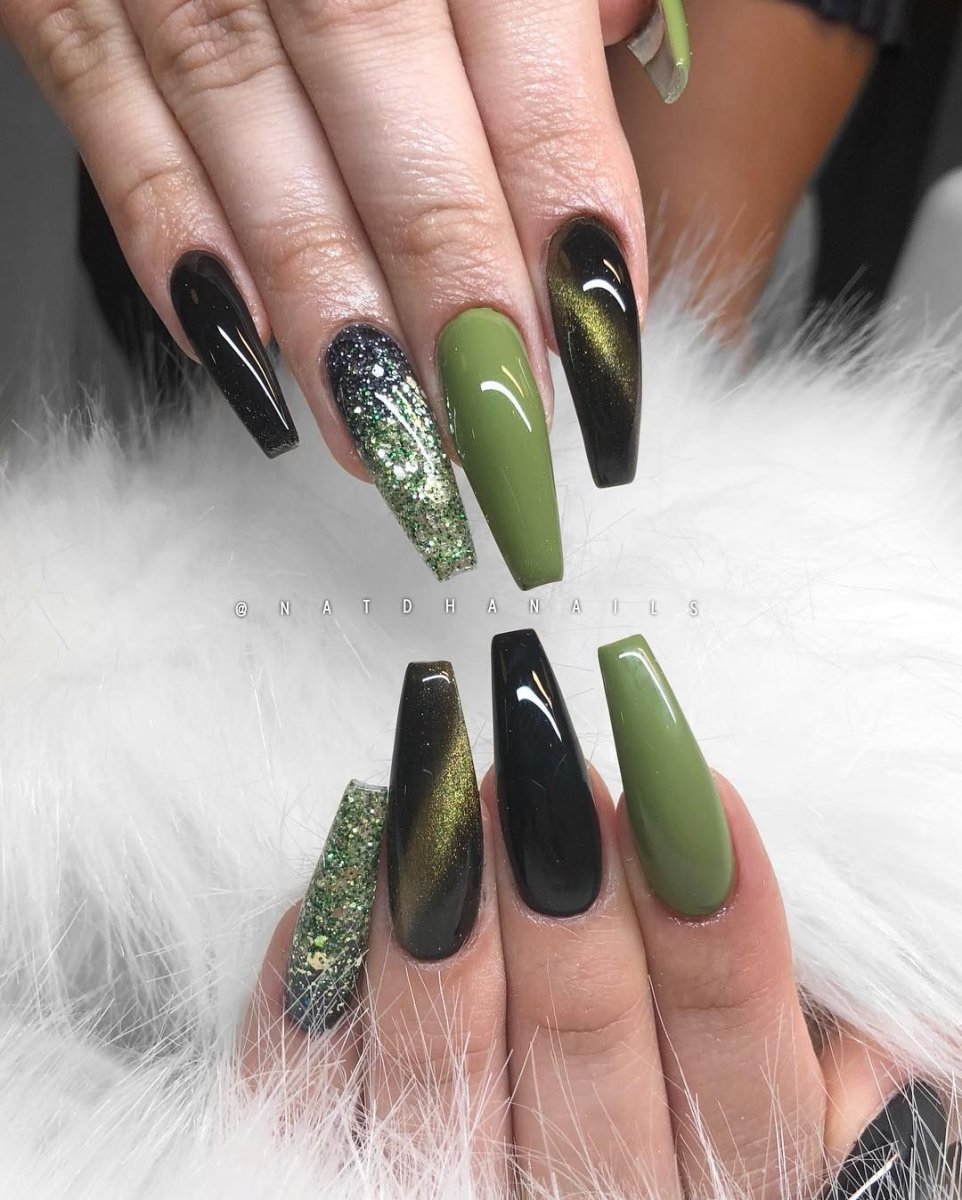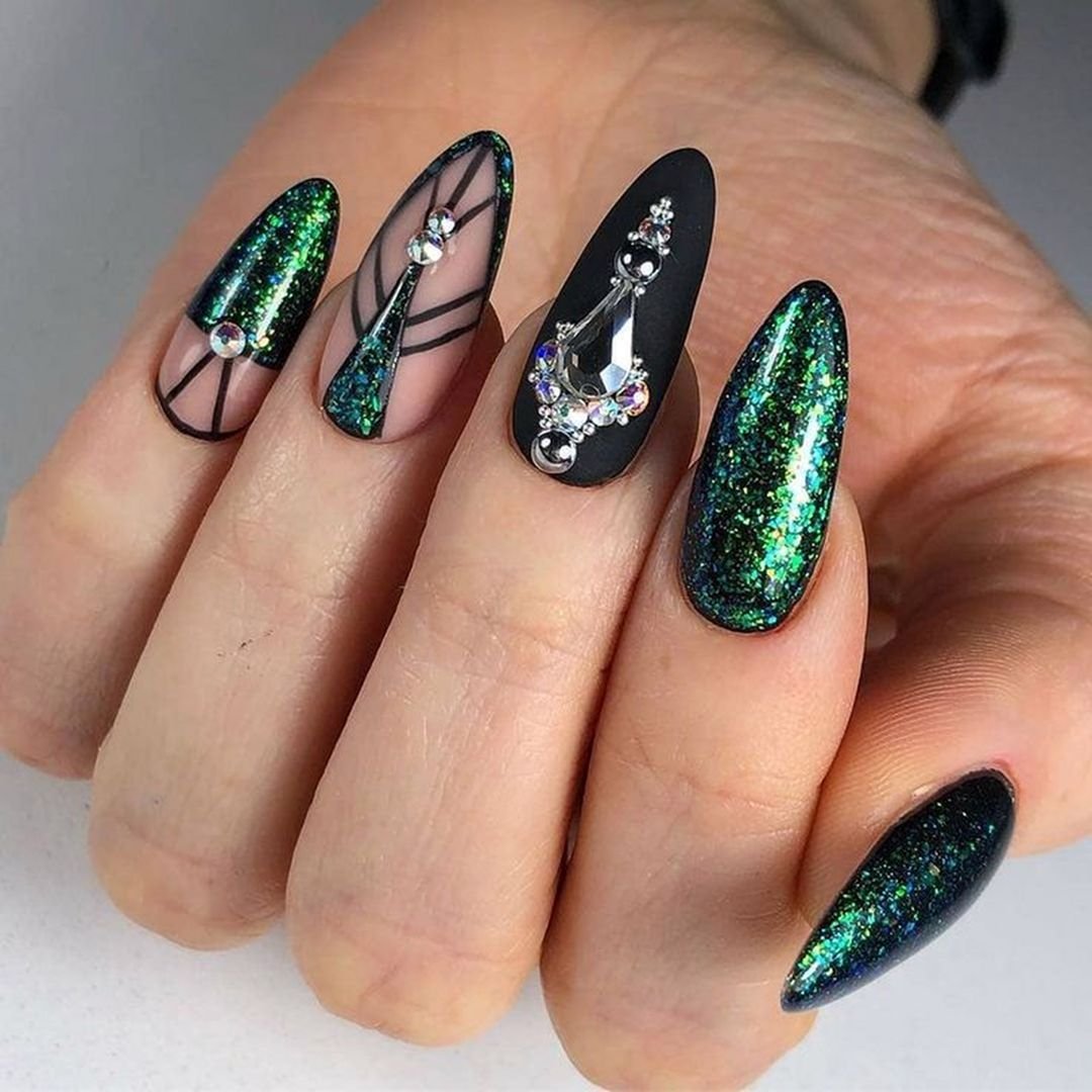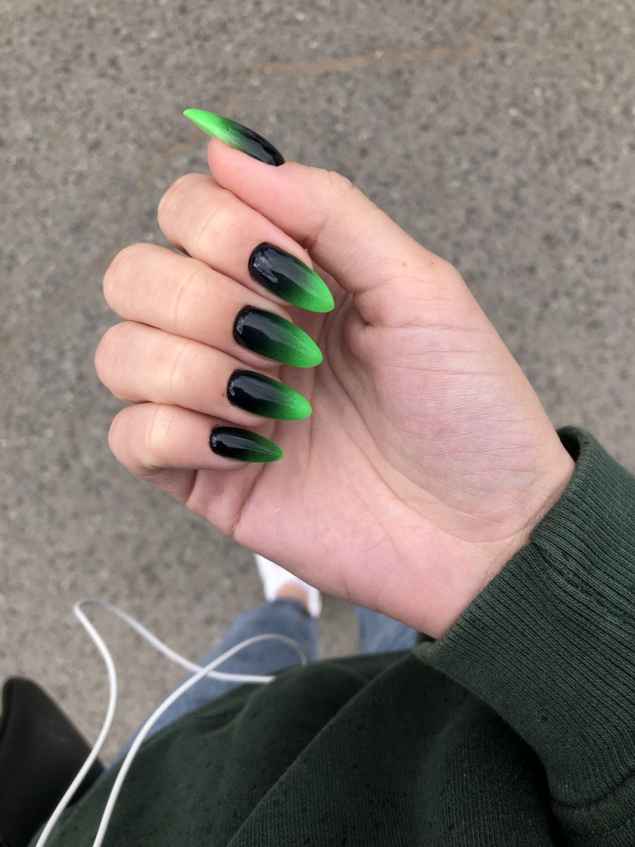 Маникюр на острые ногти черный с зеленым