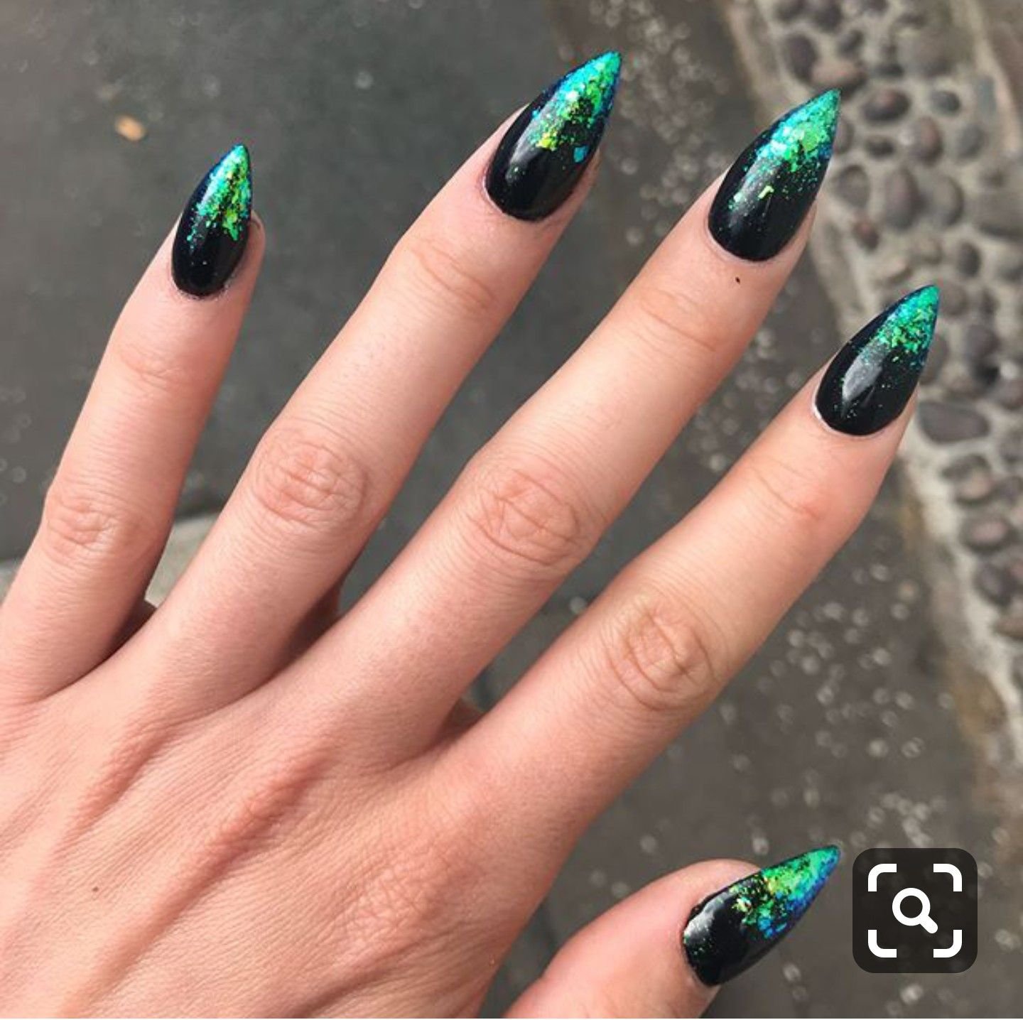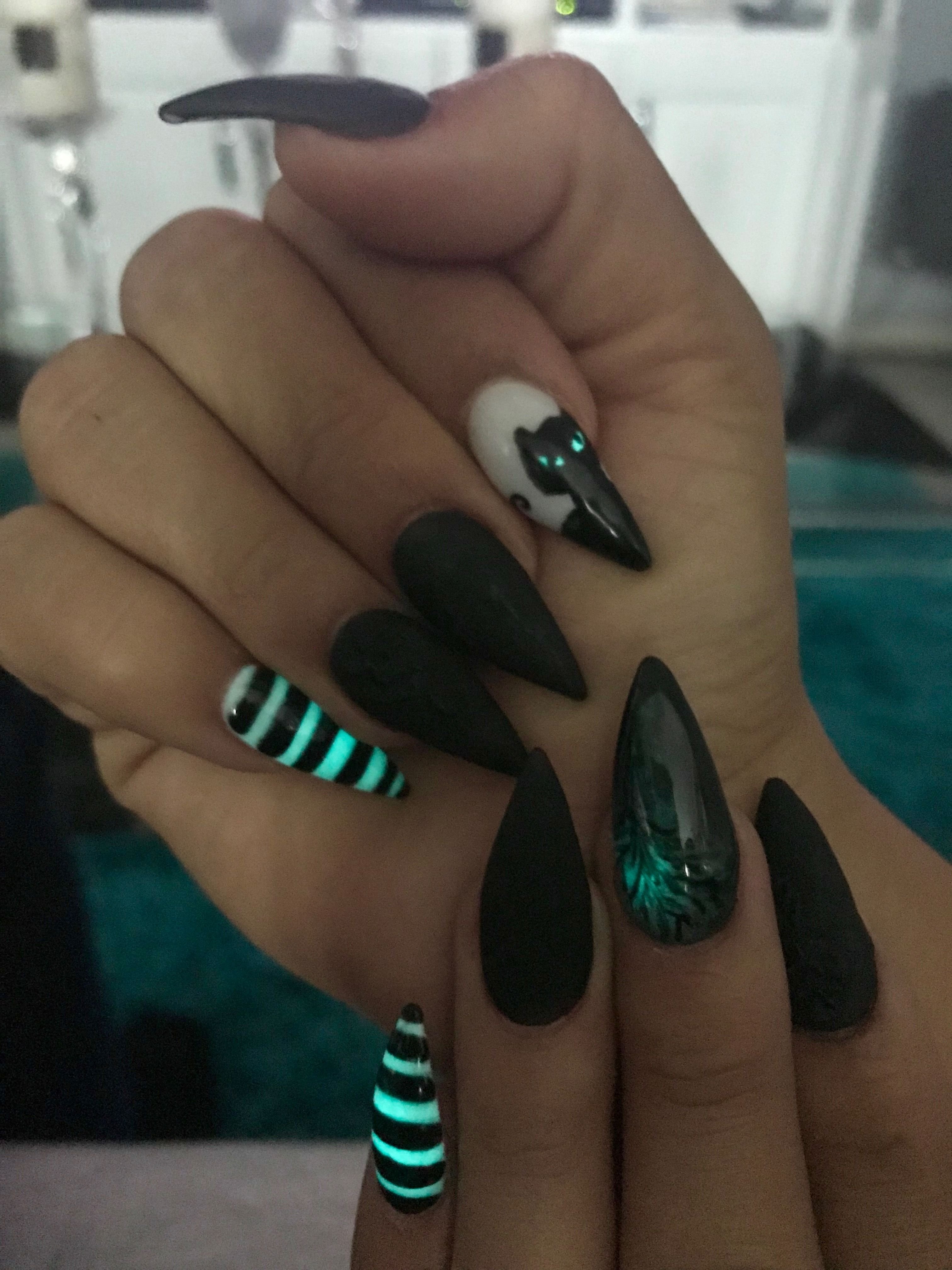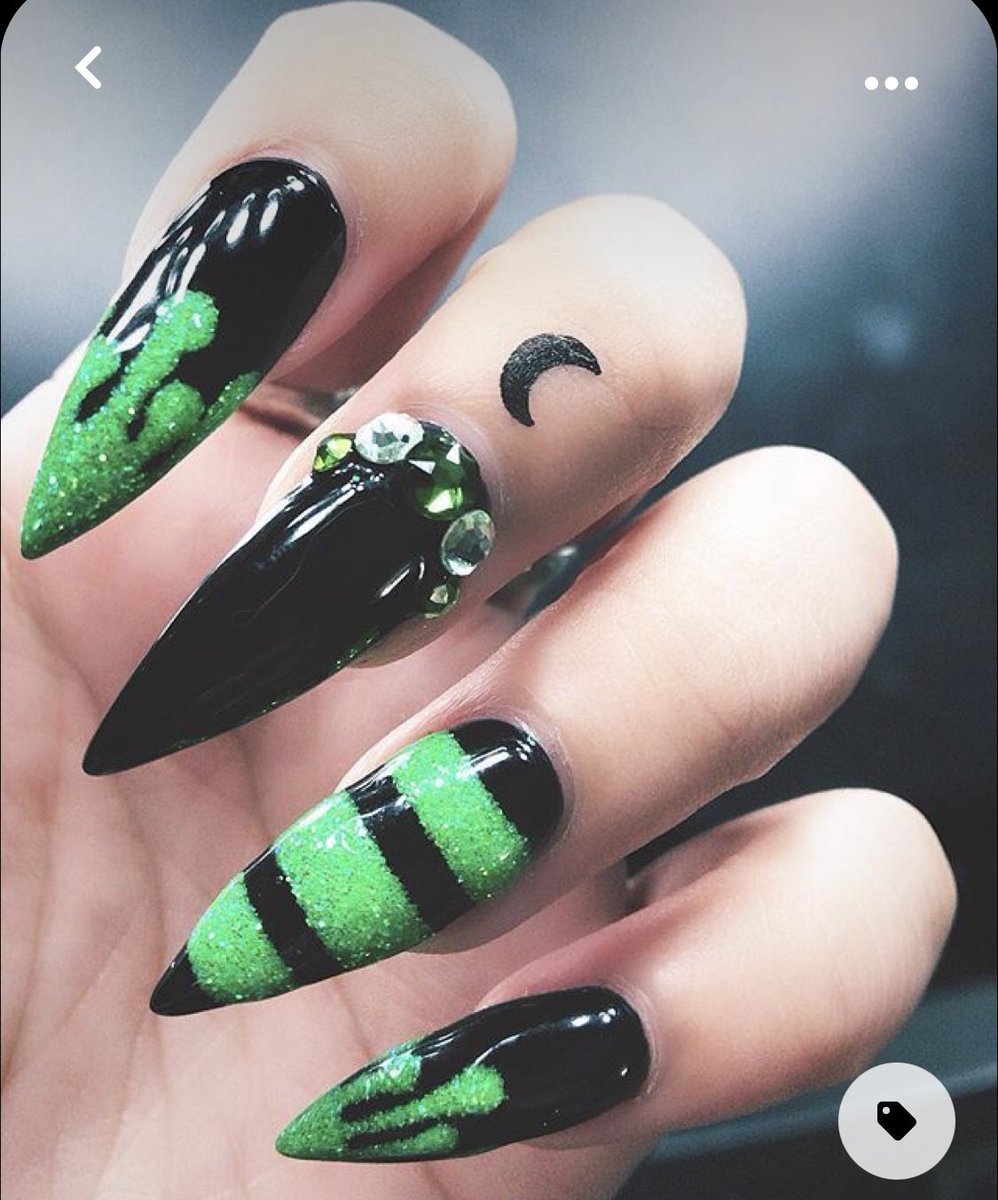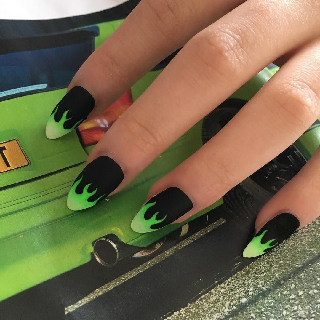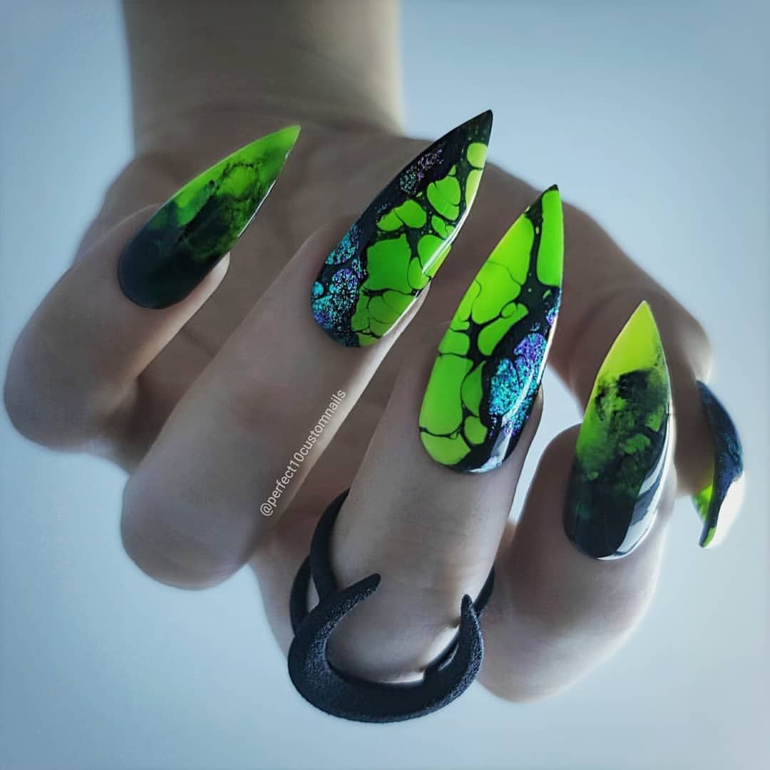 Маникюр на острые ногти черный с зеленым