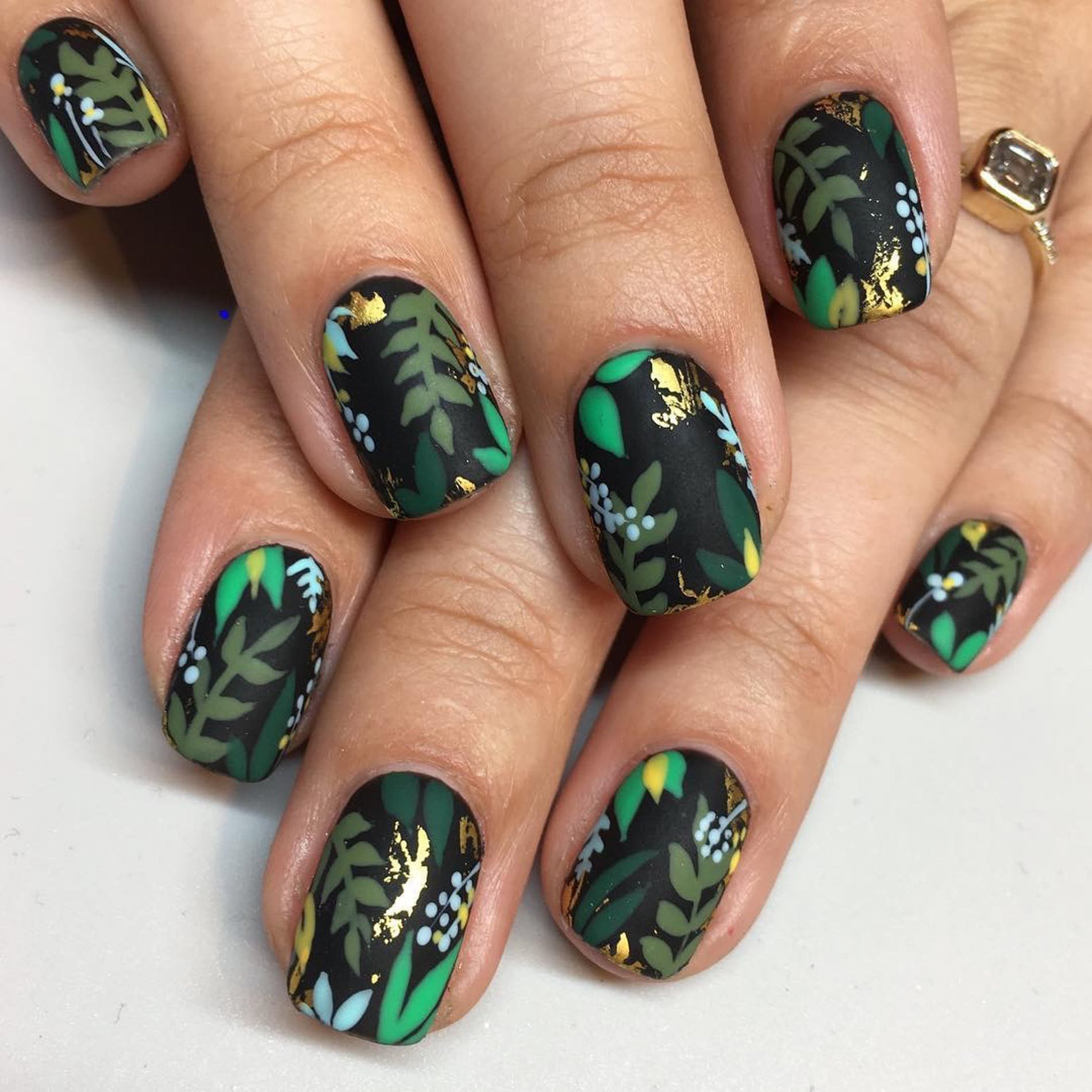 Маникюр зелёный матовый с золотом