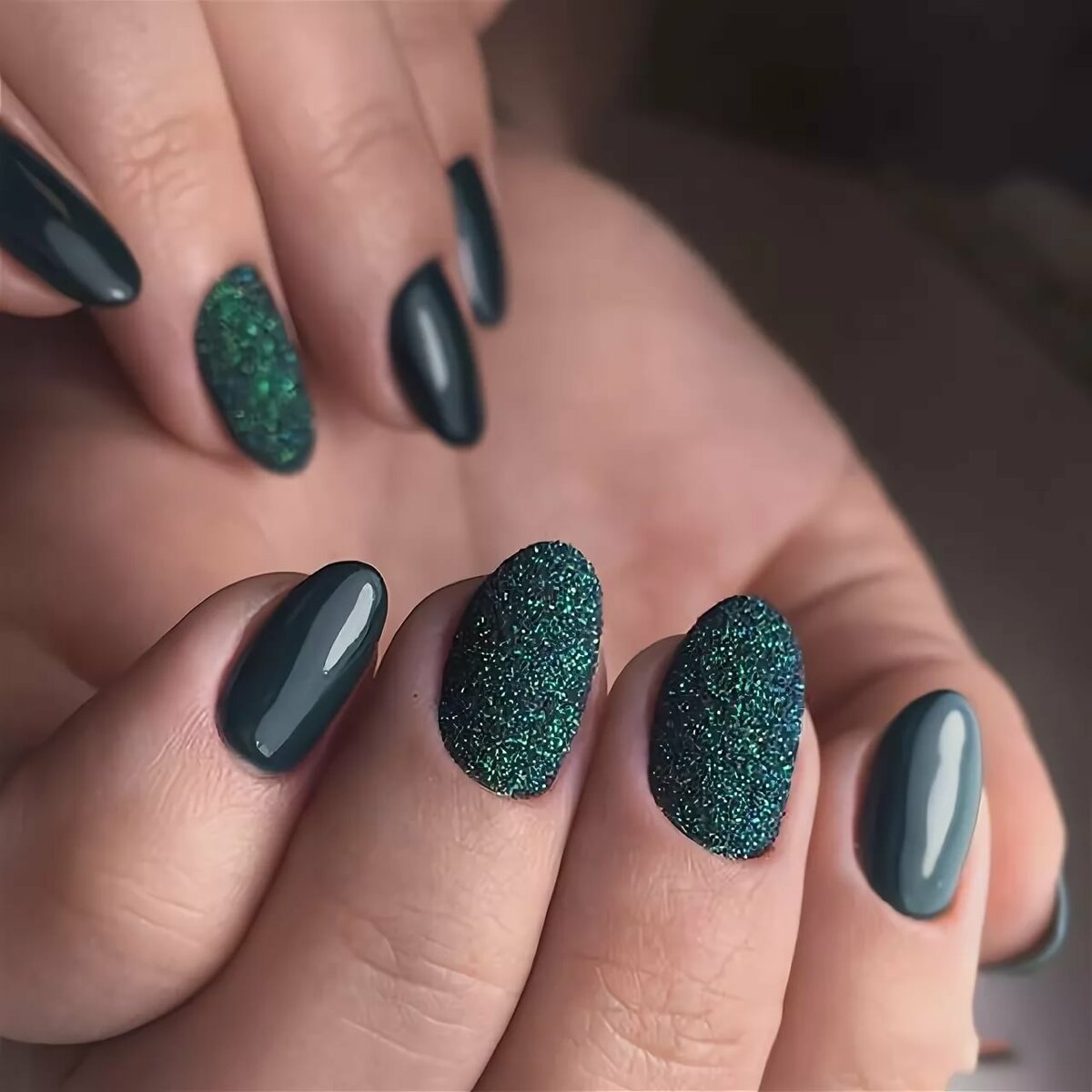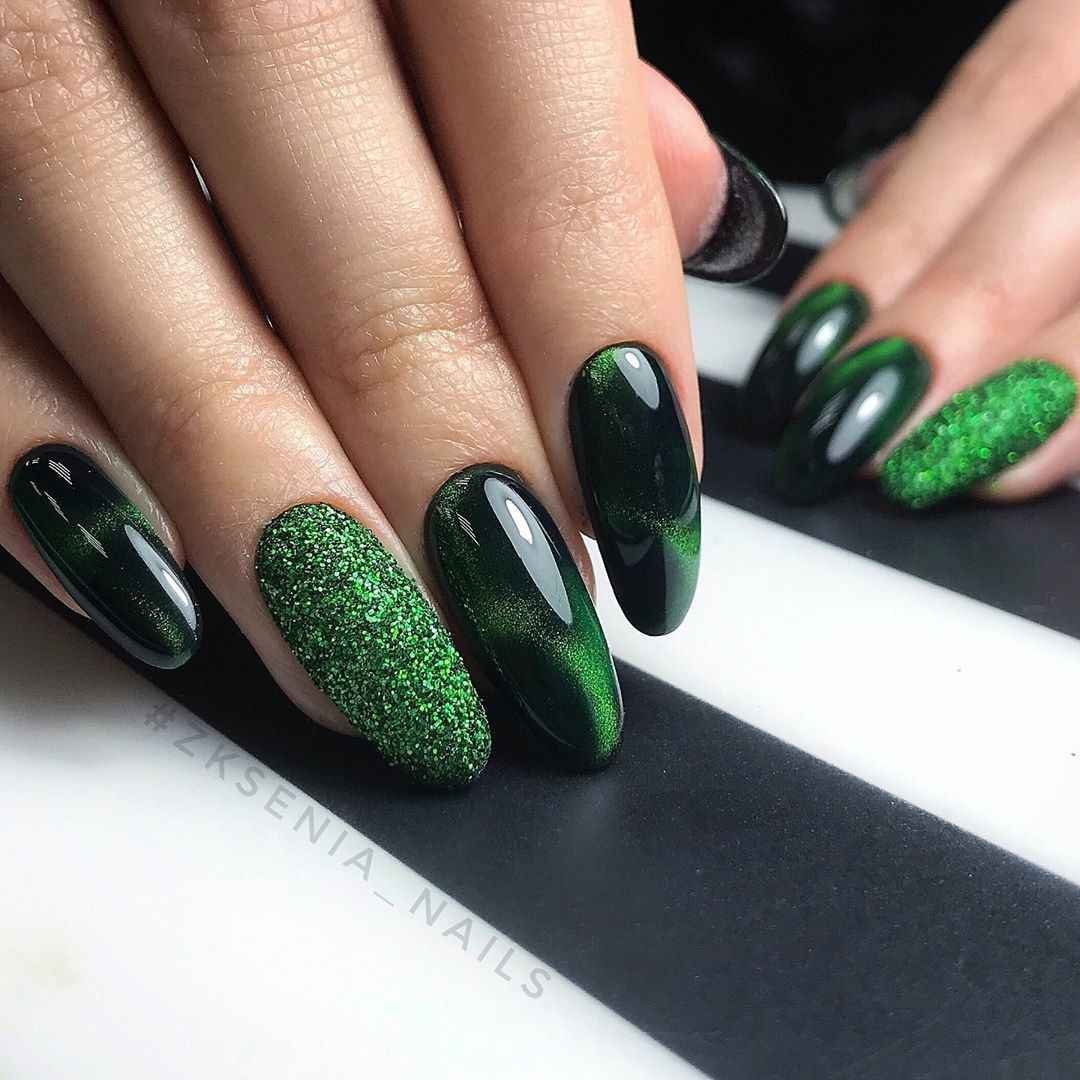 Черно зеленый маникюр миндаль