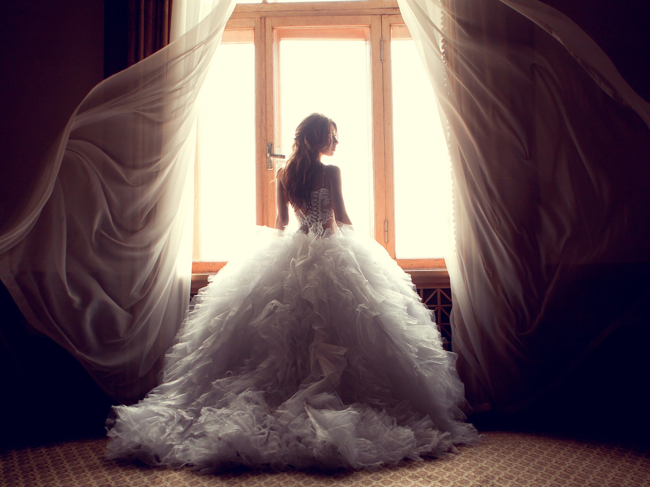 Девушка в свадебном платье со спины в темноте