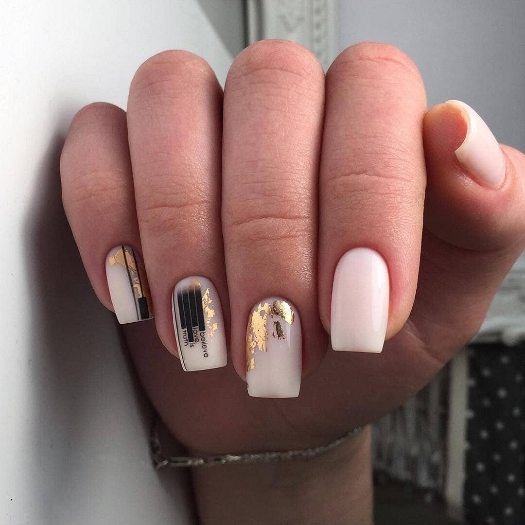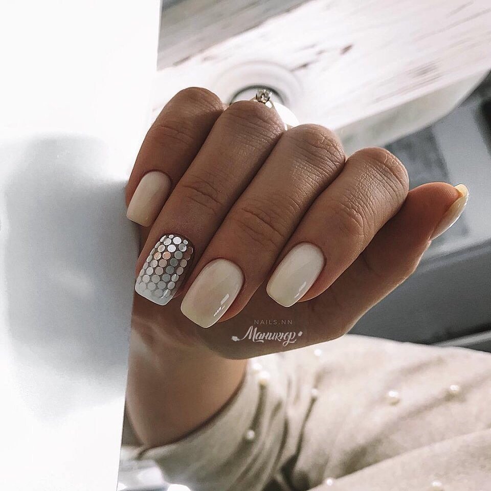 Молочный маникюр с фольгой на квадратные ногти