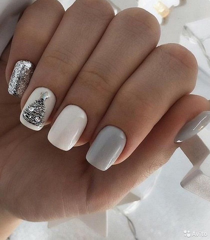 Белый новогодний маникюр на квадратные ногти