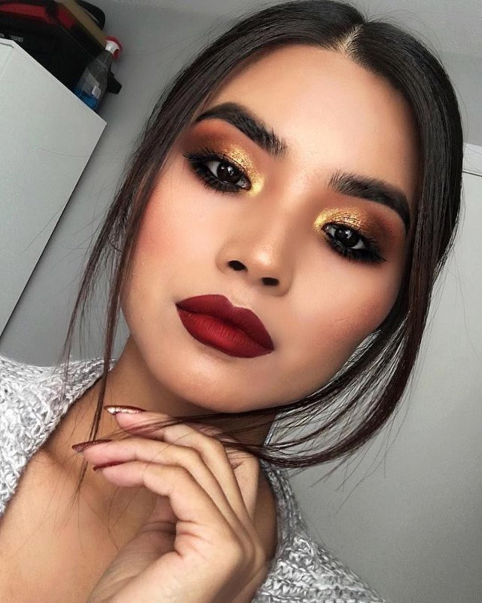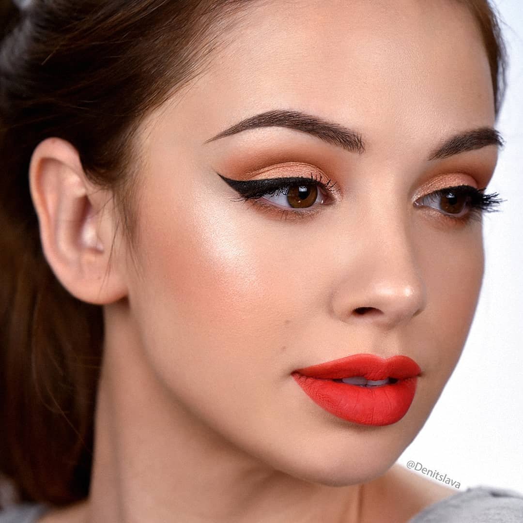 Макияж для карих глаз с красной помадой