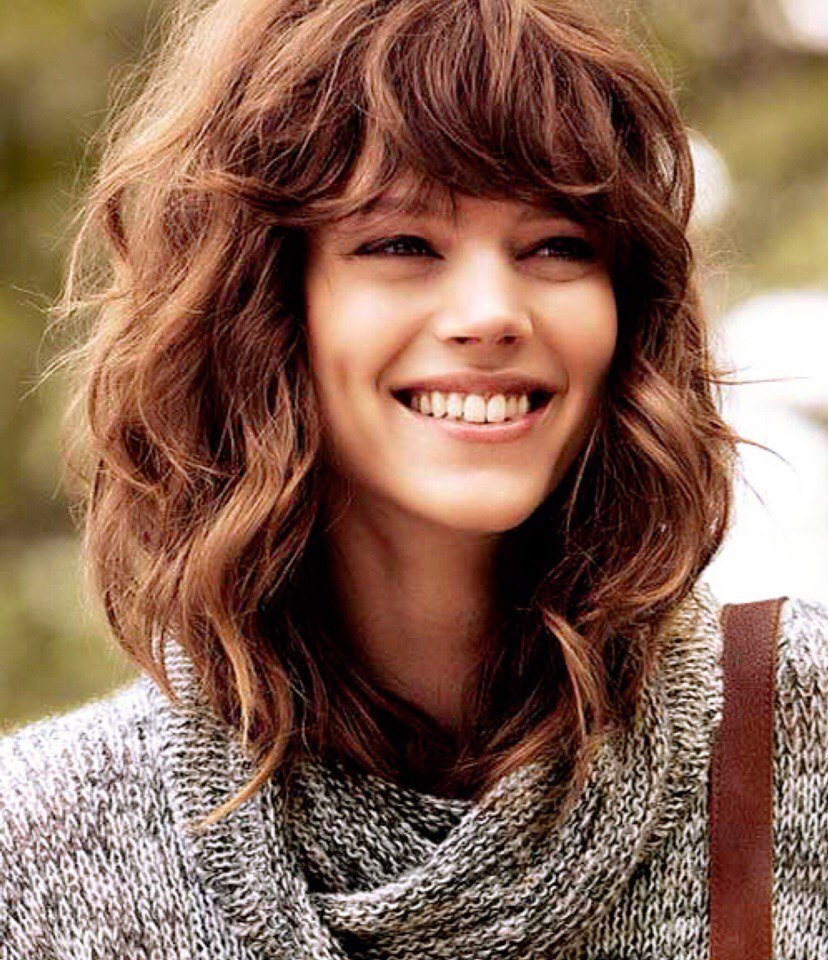 Стрижка на средние волнистые волосы с челкой