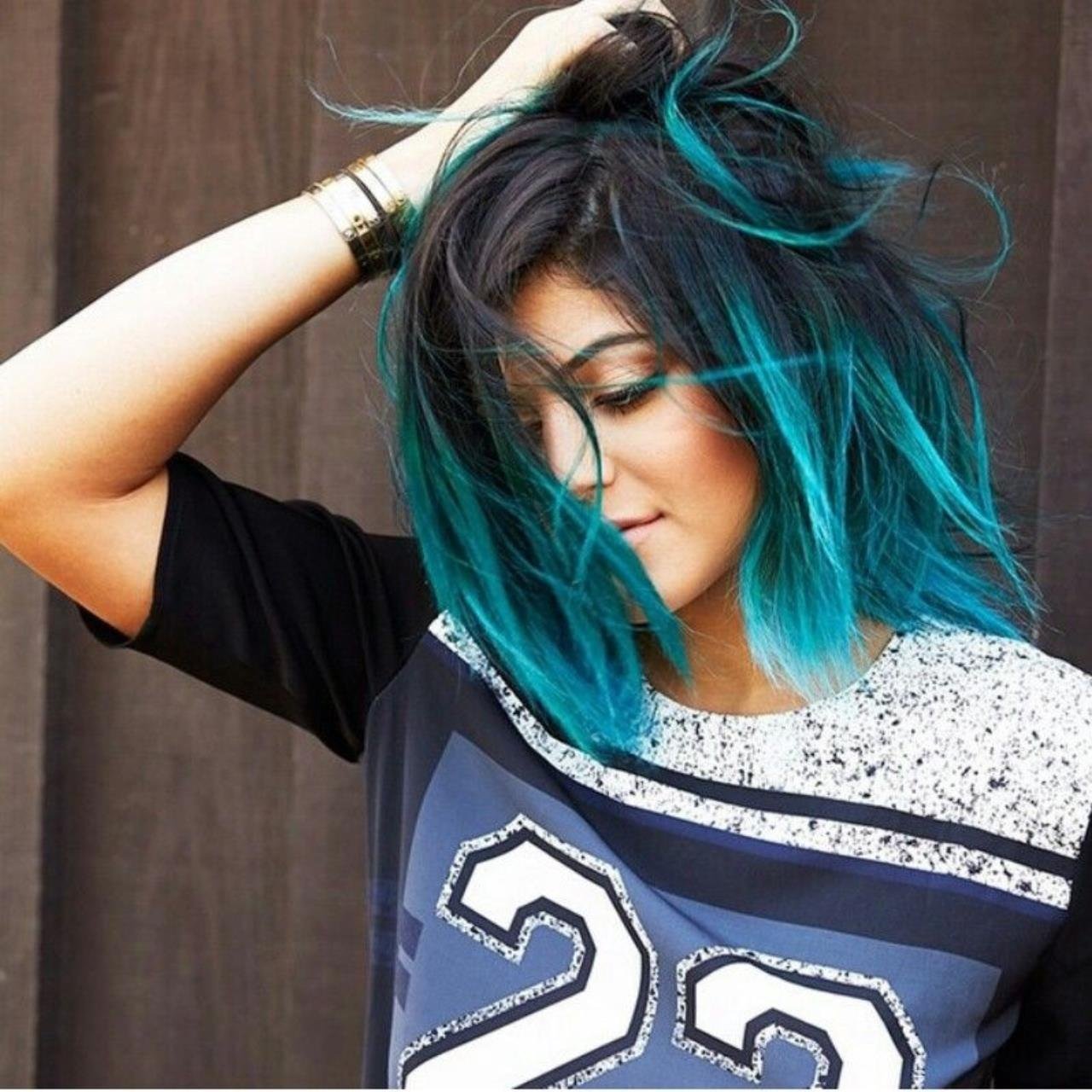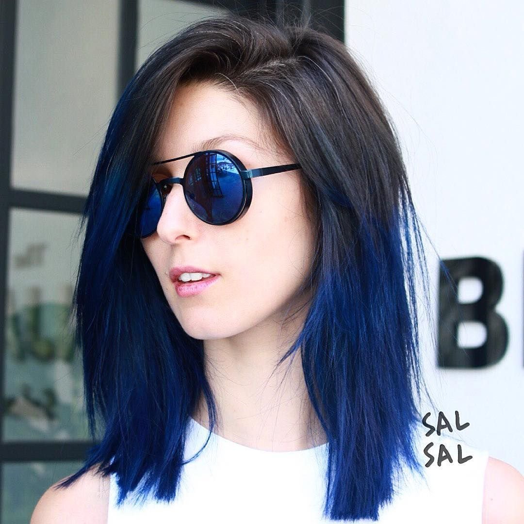 Синее омбре на темные волосы каре