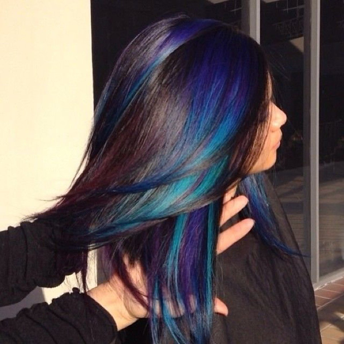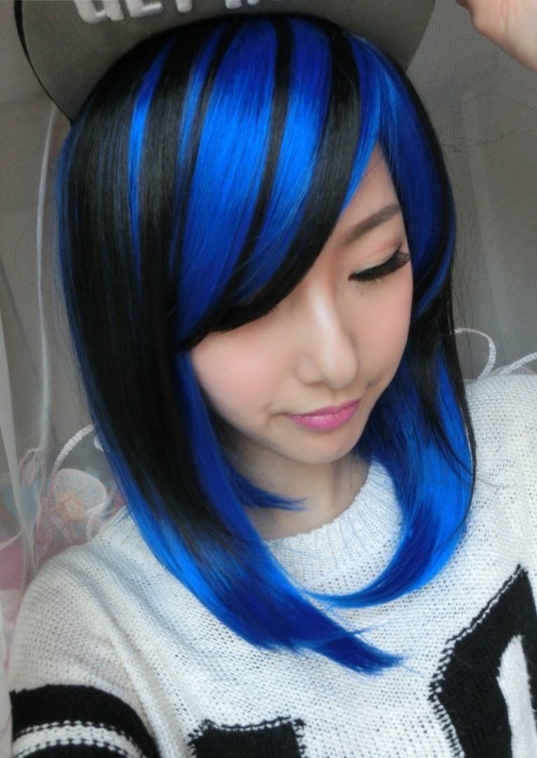 Чёрные волосы с синими прядями