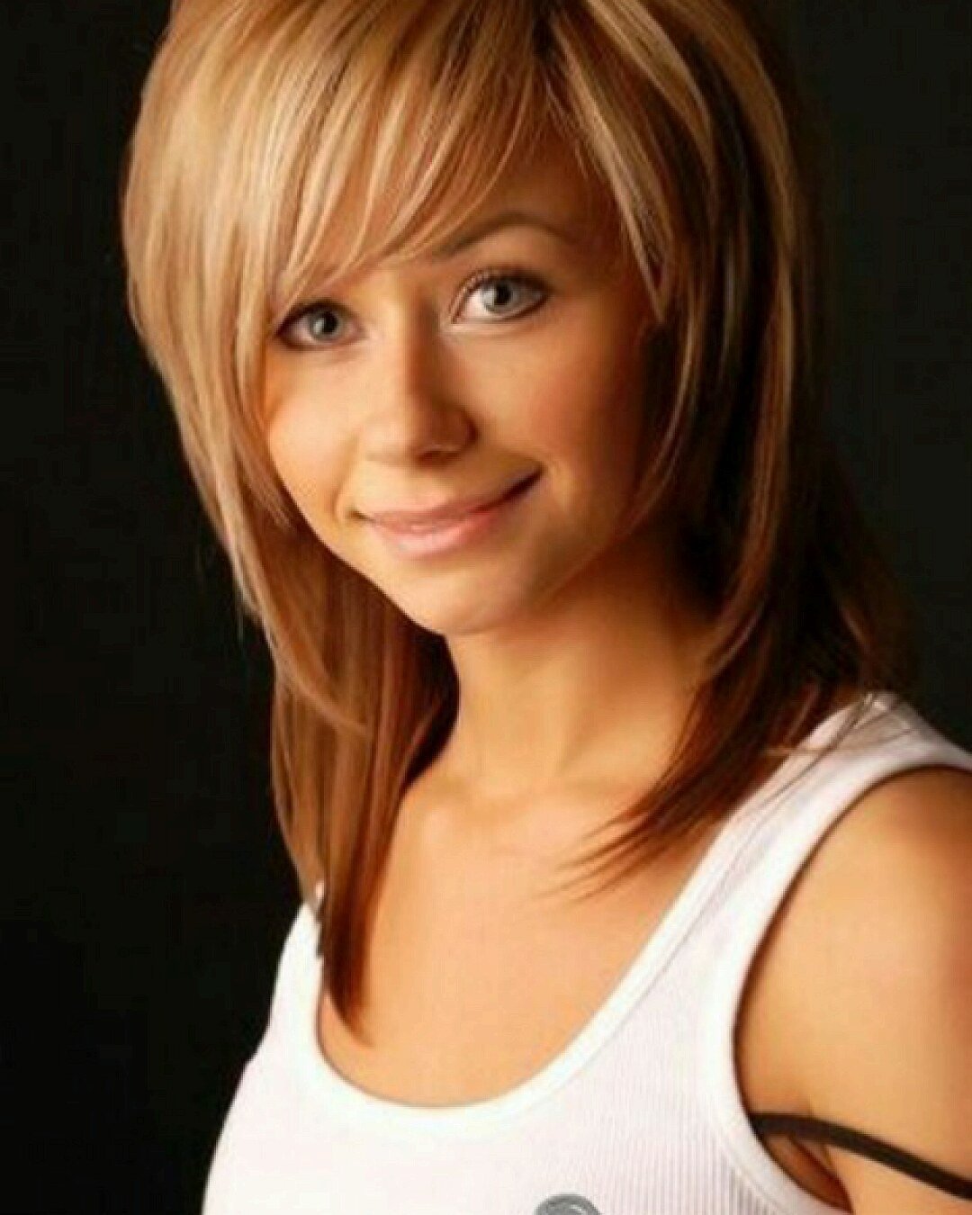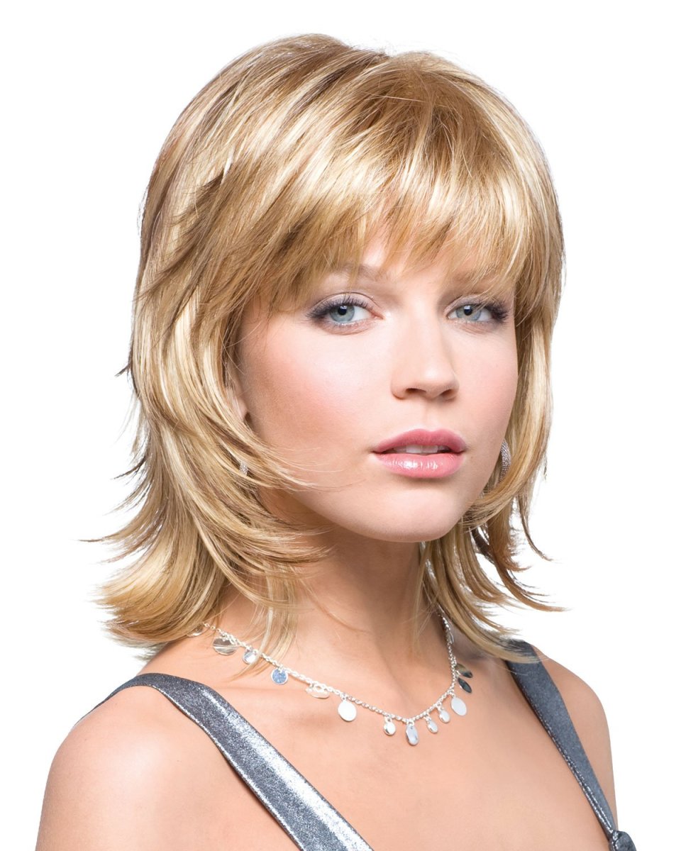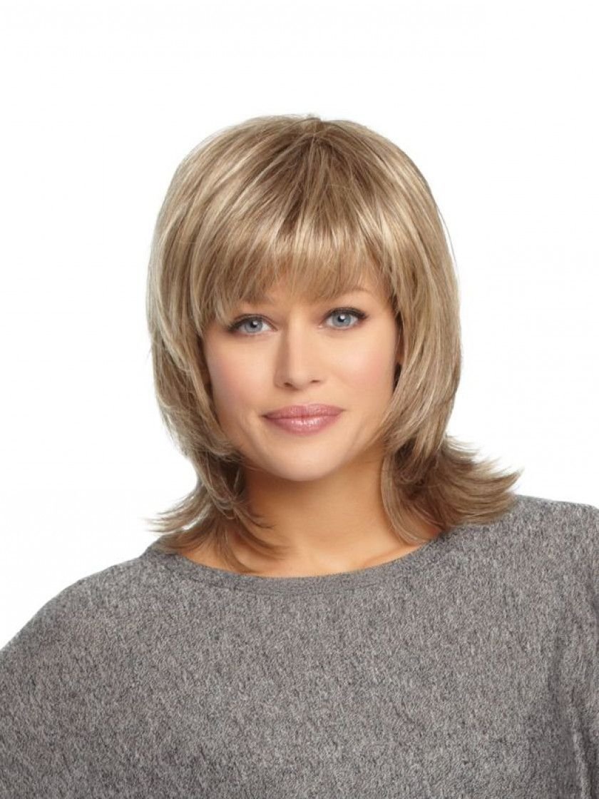Стильные стрижки Каскад на средние волосы с челкой для круглого лица