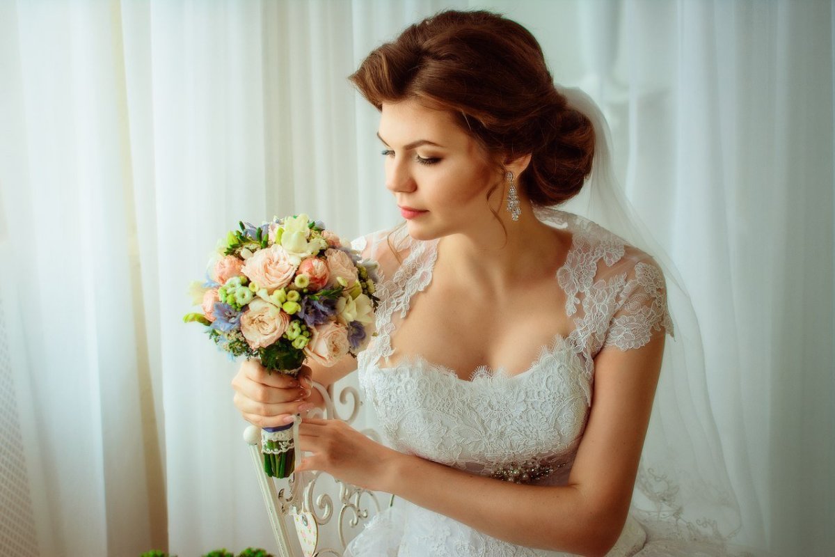Причёски на свадьбу на средние волосы для невесты без фаты с челкой
