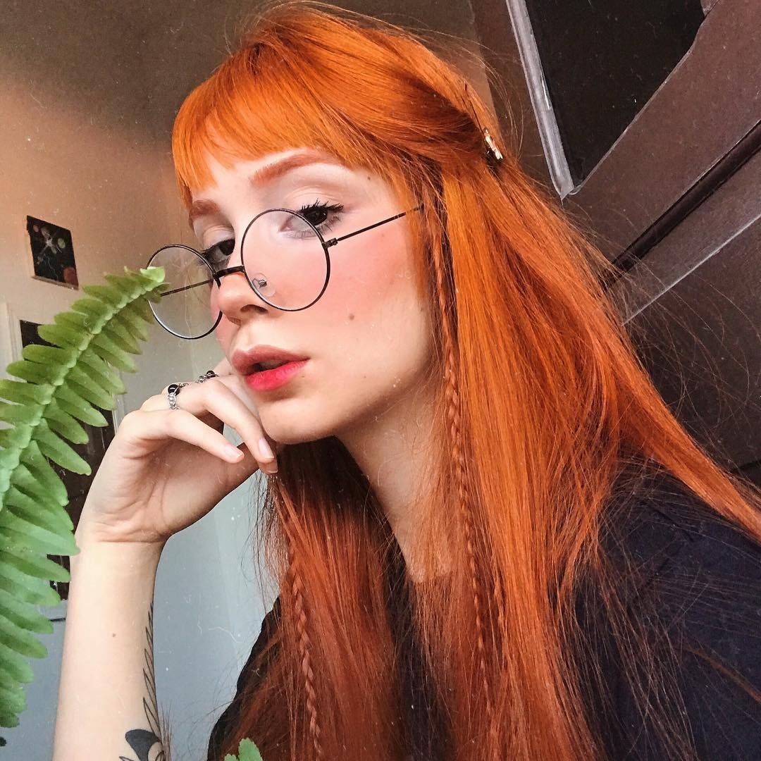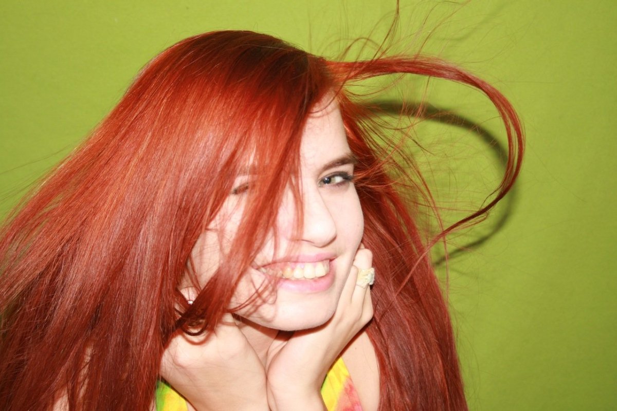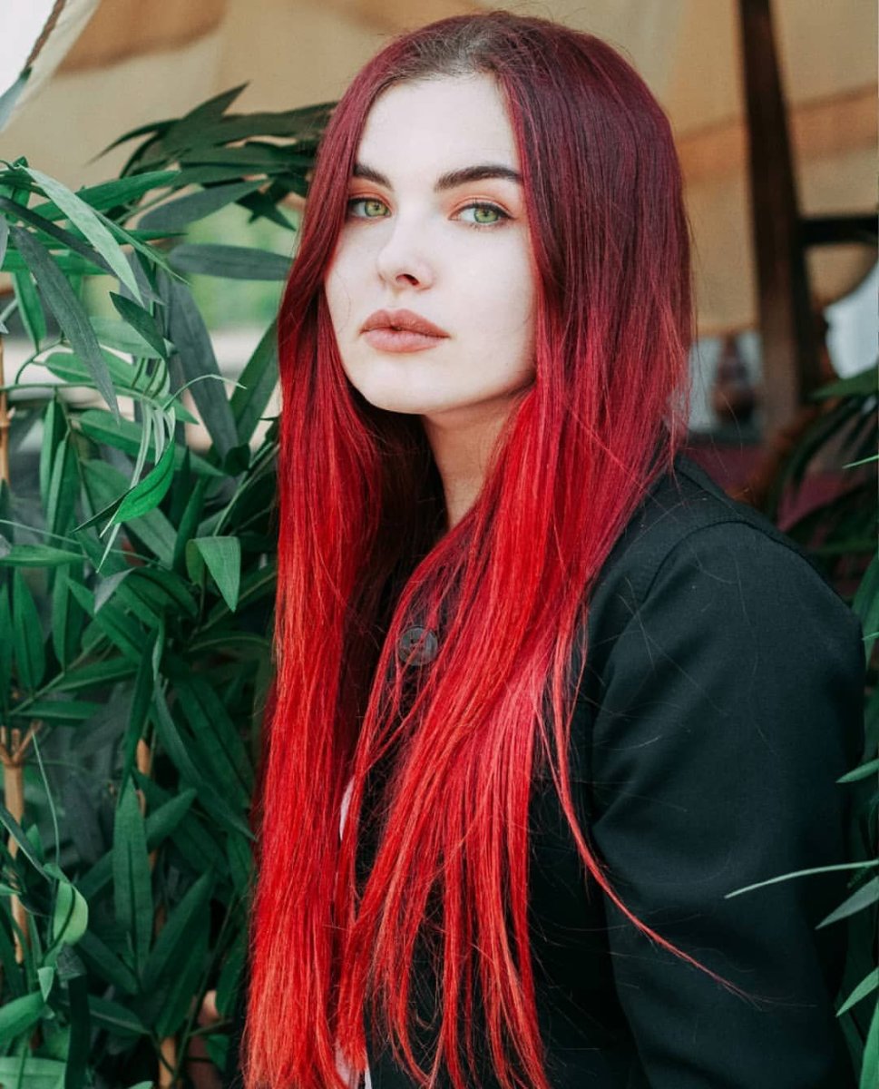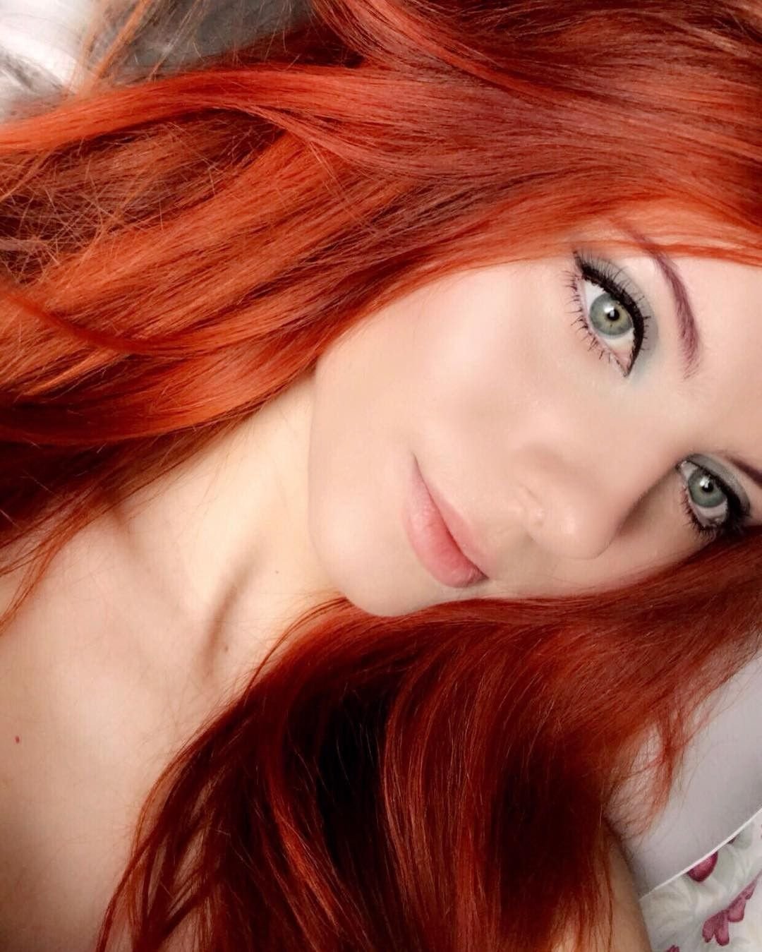 Девушка с бледной кожей, красными волосами, и мешками под глазами