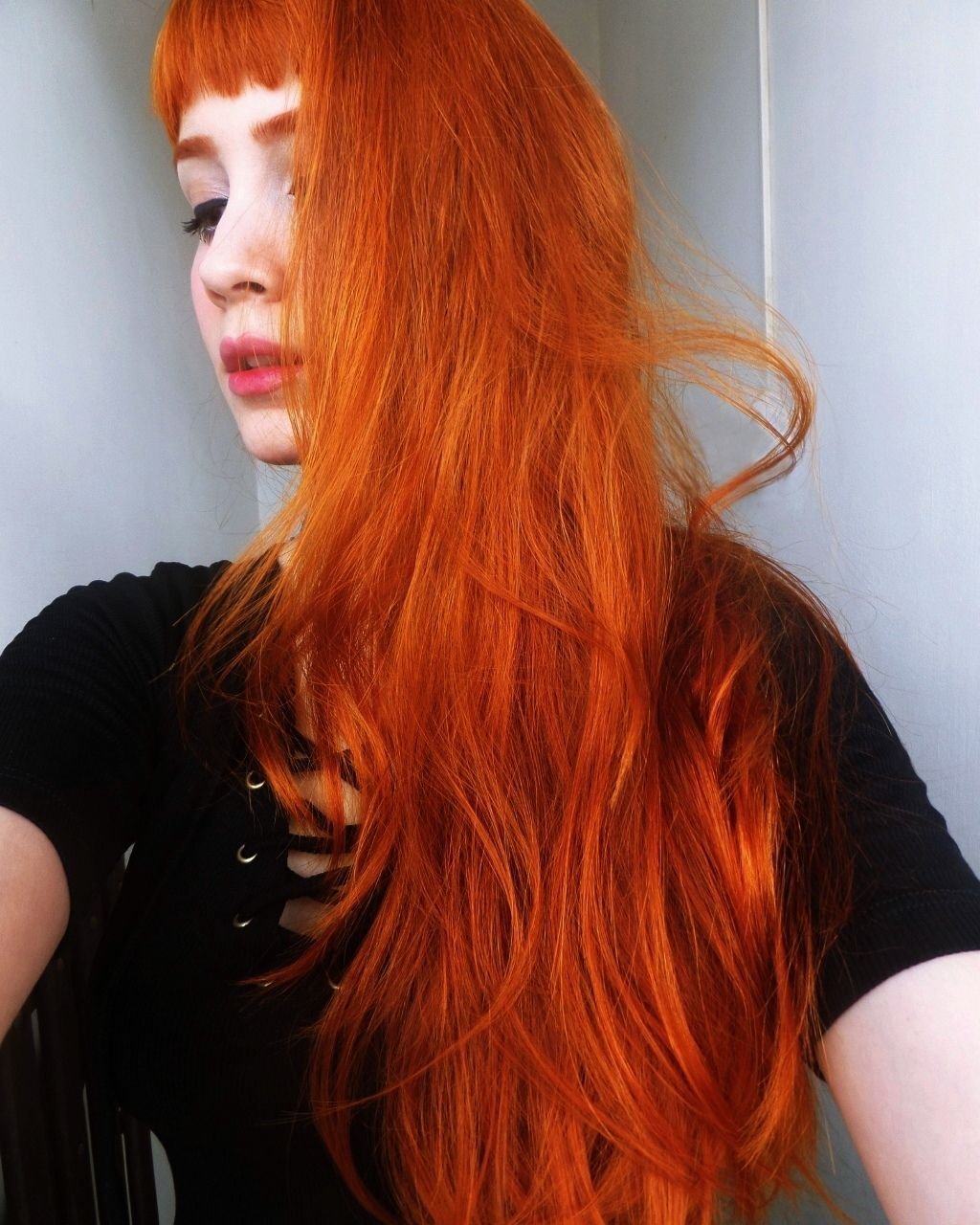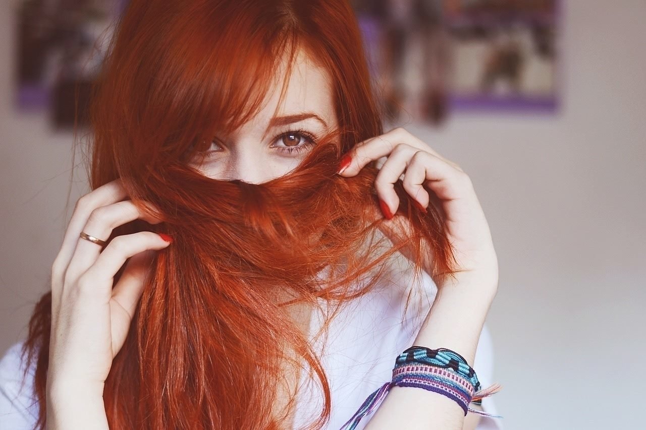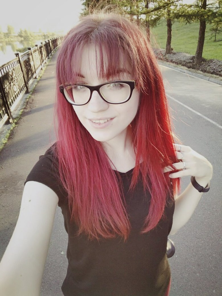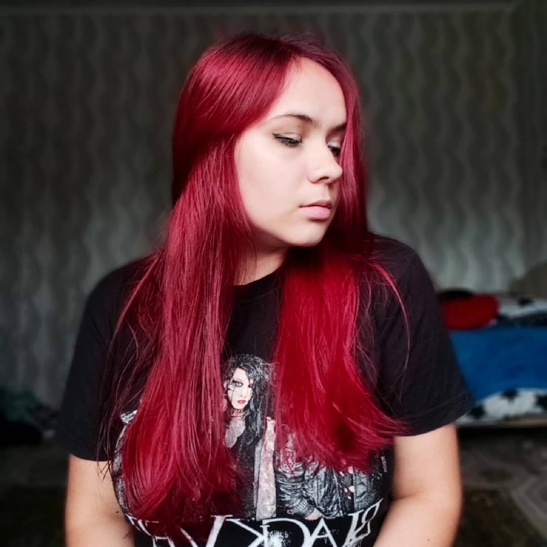 Девушка с бледной кожей, красными волосами, и мешками под глазами