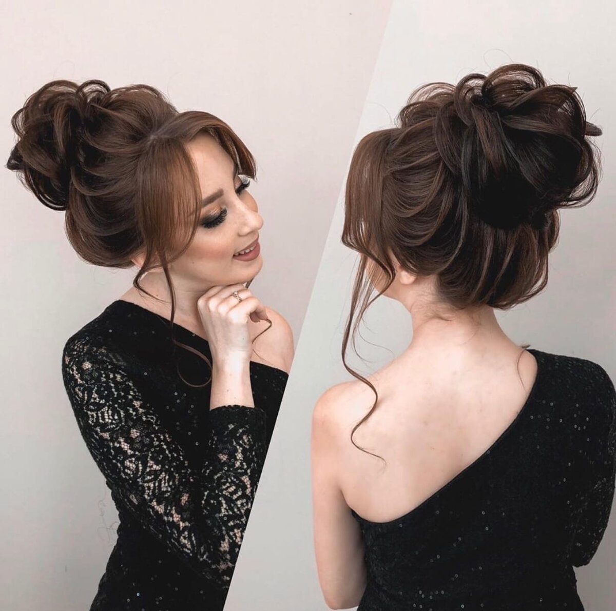 Прическа высокий пучок с челкой
