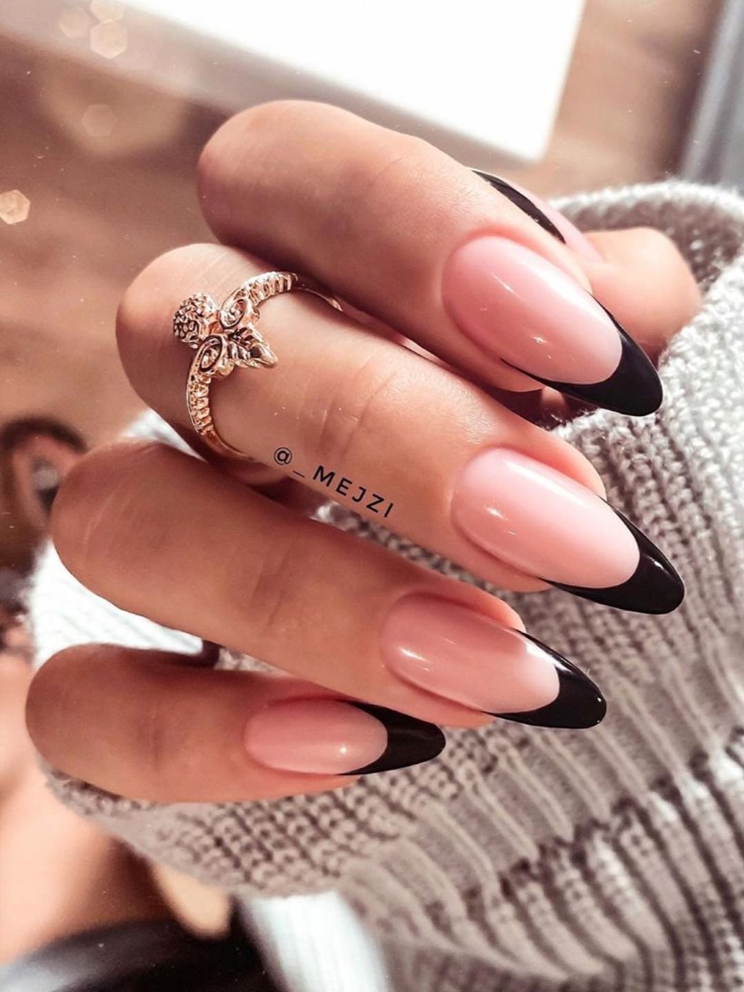Чёрный френч на ногтях миндалевидной 2021